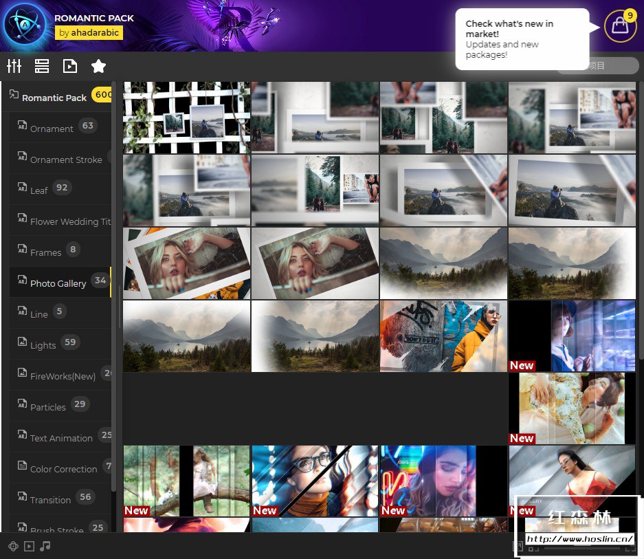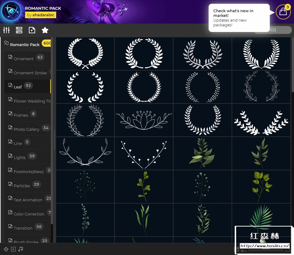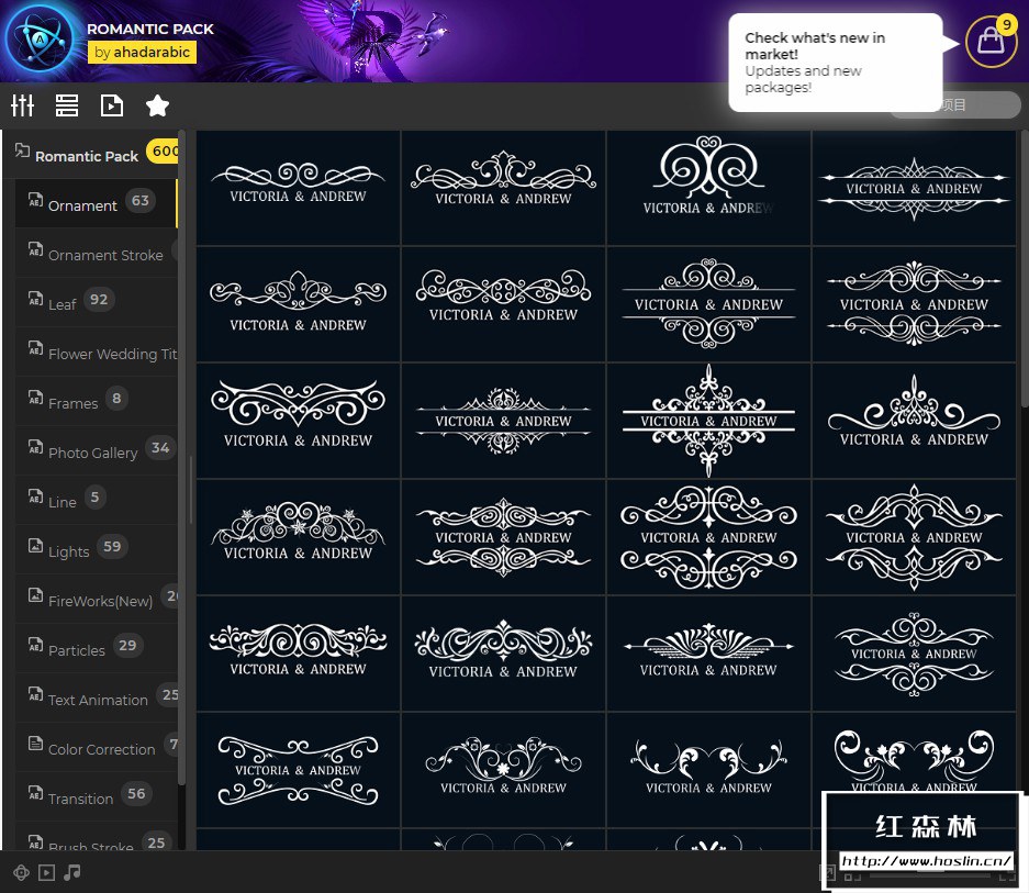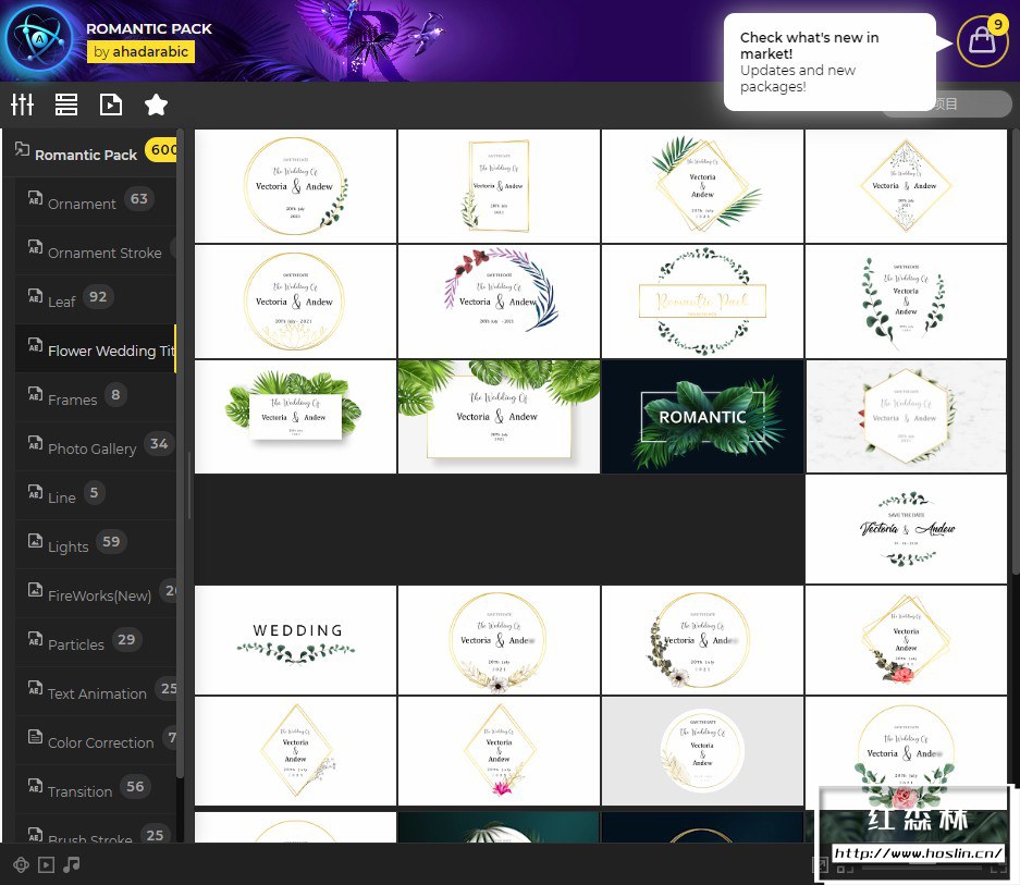 600组浪漫婚礼爱情文字标题转场调色藤蔓花纹光效粒子动画,通过AtomX脚本调用预设,可视化预览,直接使用于时间线。能够修改文字,颜色等属性。