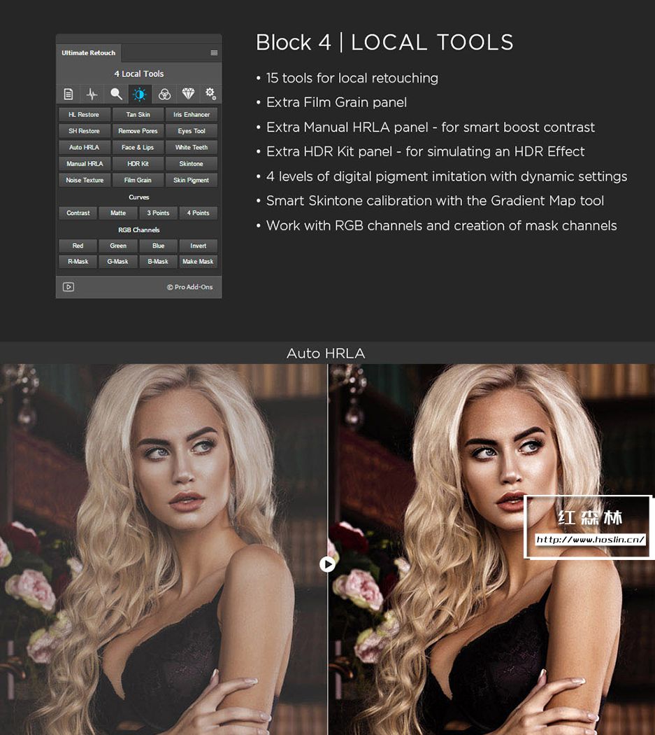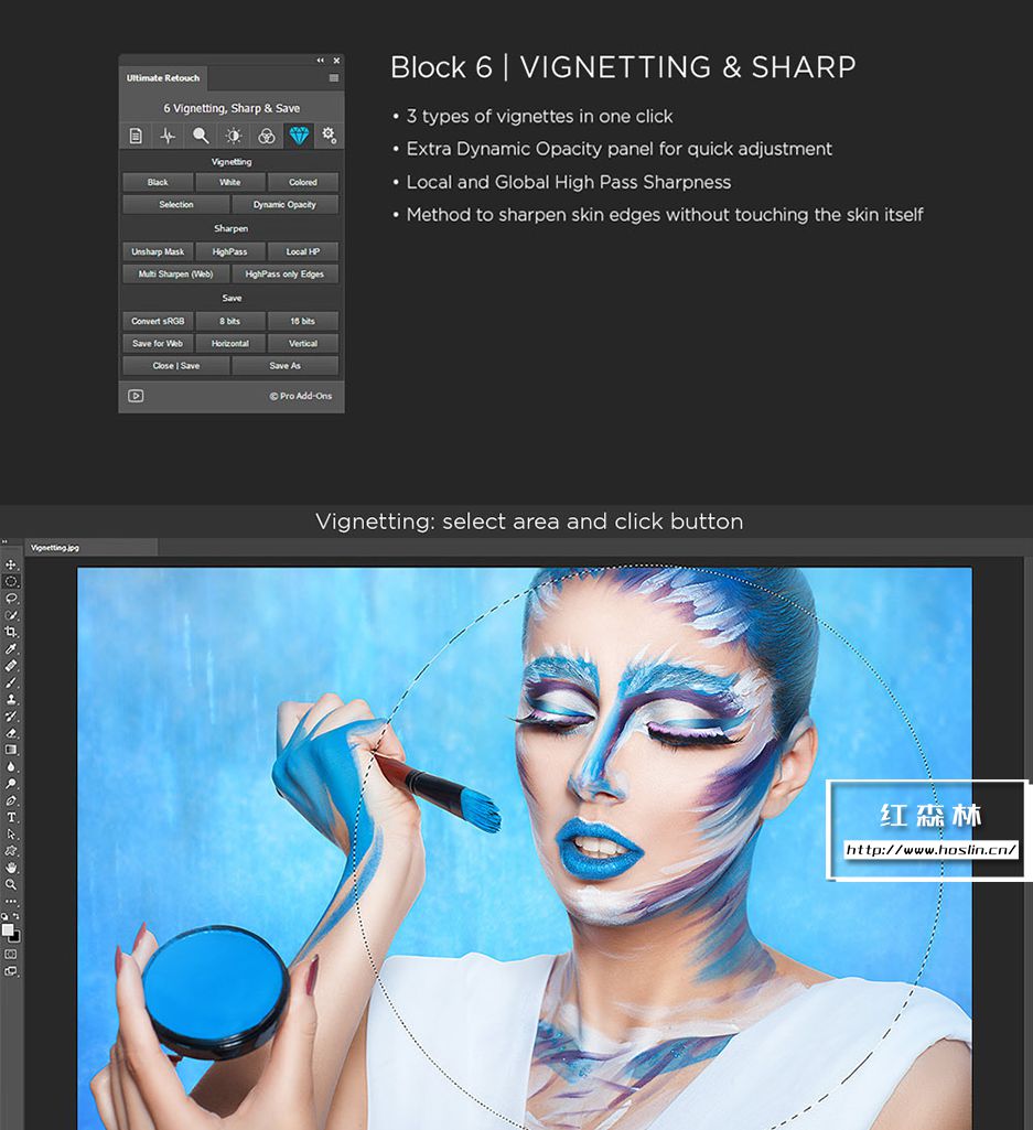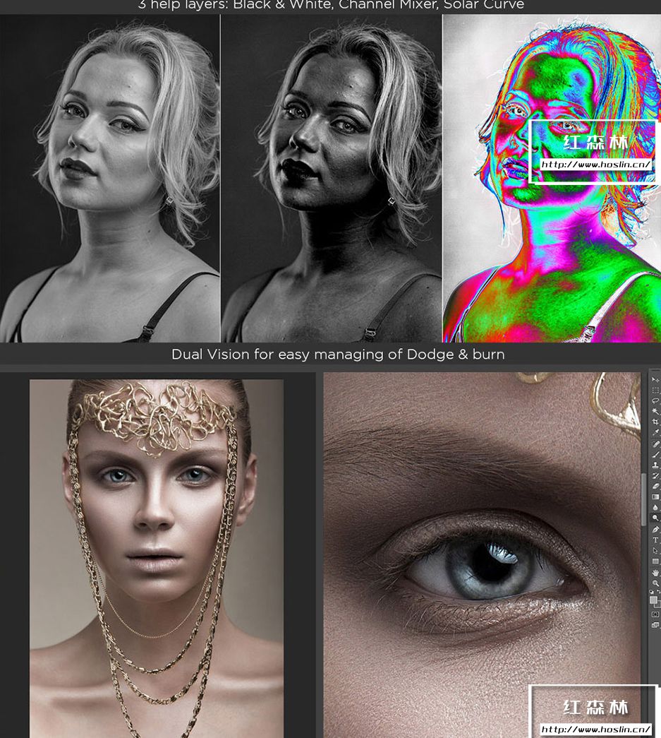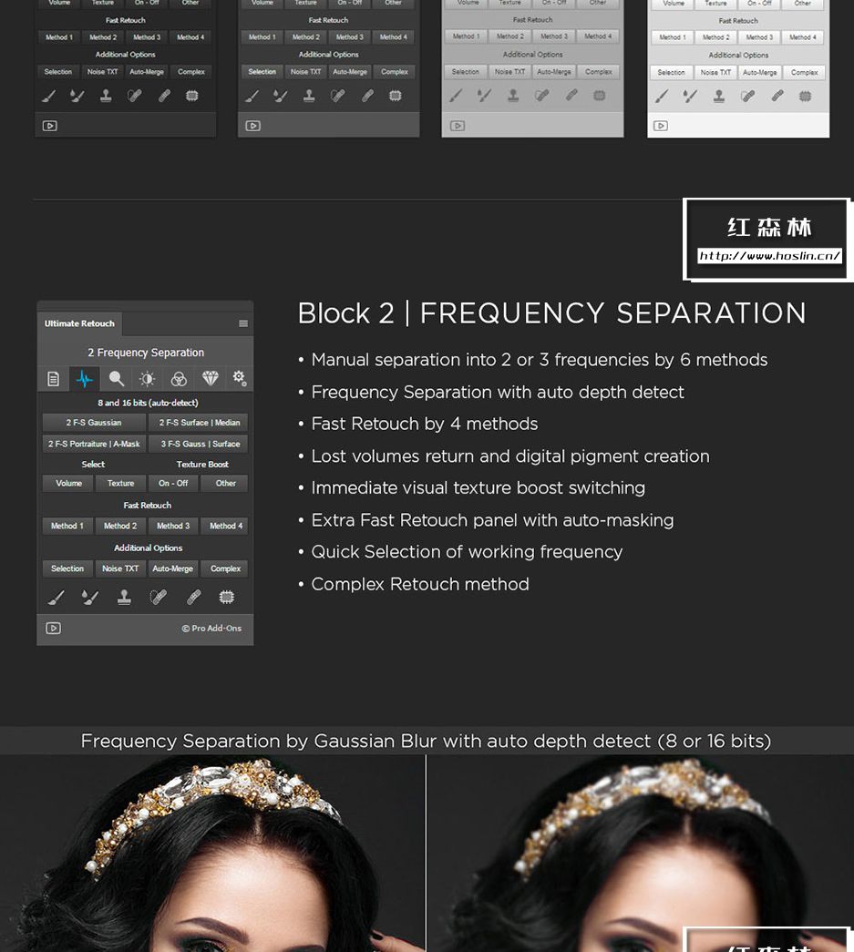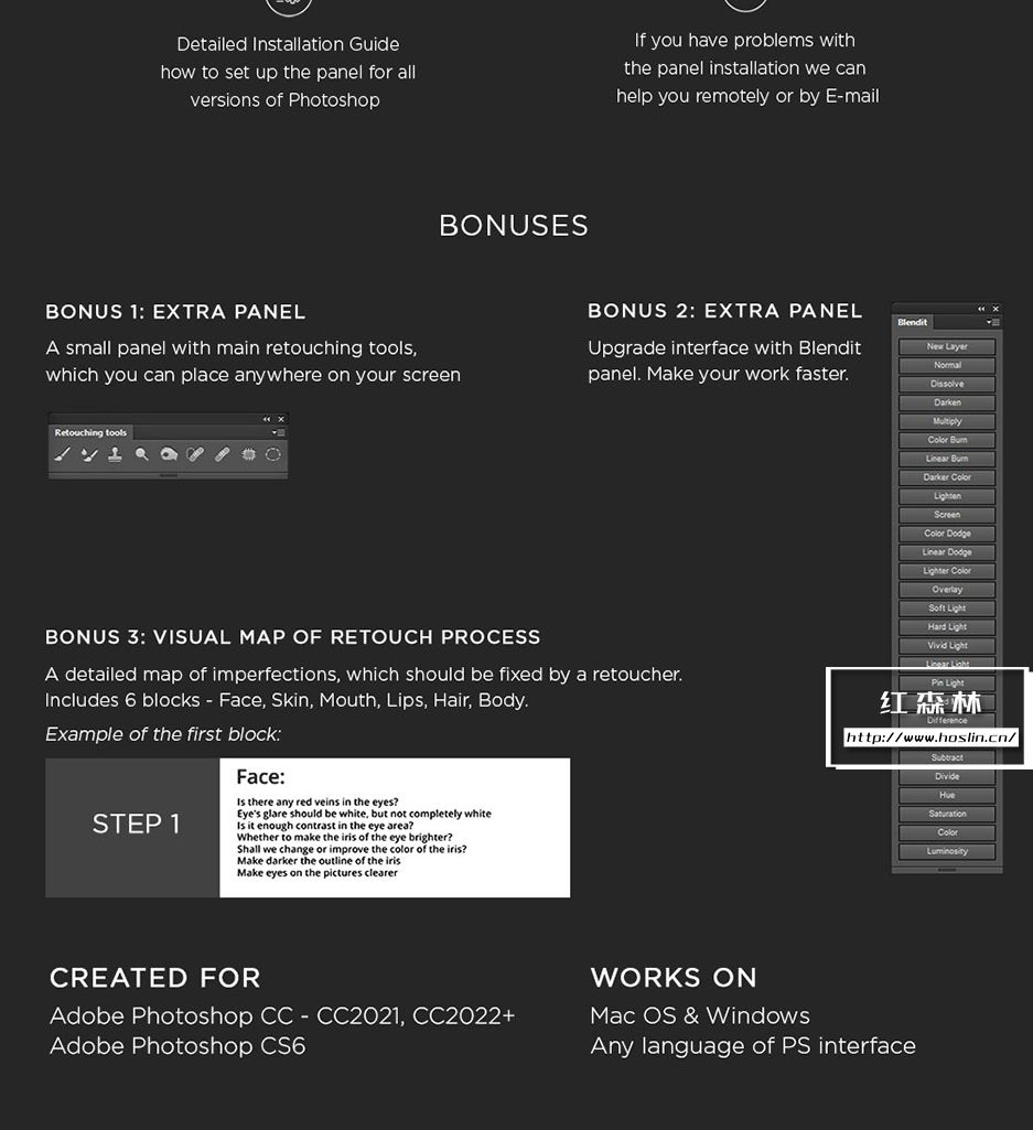插件主要特点:支持 Photoshop CS6、CC-CC2021、CC2022(MAC 和 WINDOWS)。一个面板包含 200 个功能,7个独特的修饰块,3种快速润饰方法。8 位和 16 位频率分离,65种颜色预设,有20 个自定义按钮,用于您的个人操作。即时视觉纹理增强切换,4种方法用于调整 Dodge & Burn。3个帮助层来捕捉缺陷和不规则之处,双视觉可轻松管理 Dodge 和 Burn。使用 RGB 通道和蒙版,局部和全局高通清晰度,动态不透明度和晕影,多色调效果。