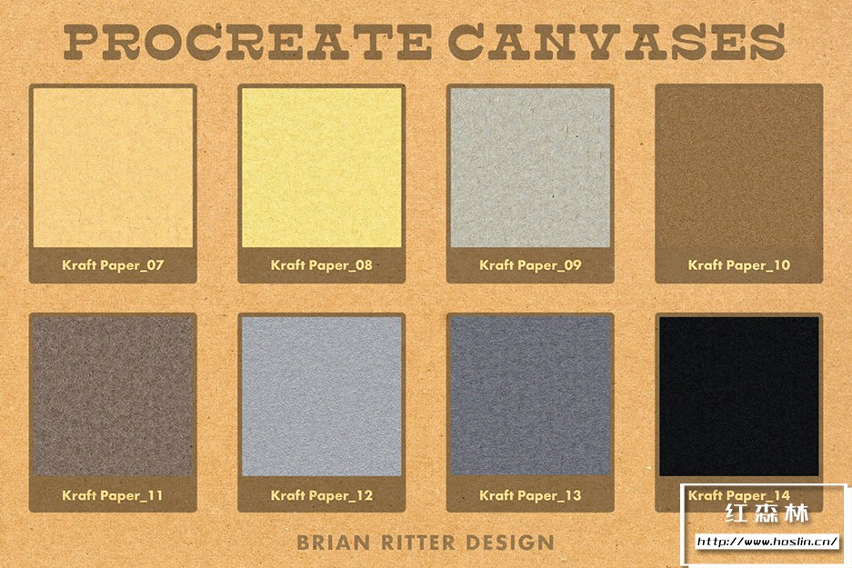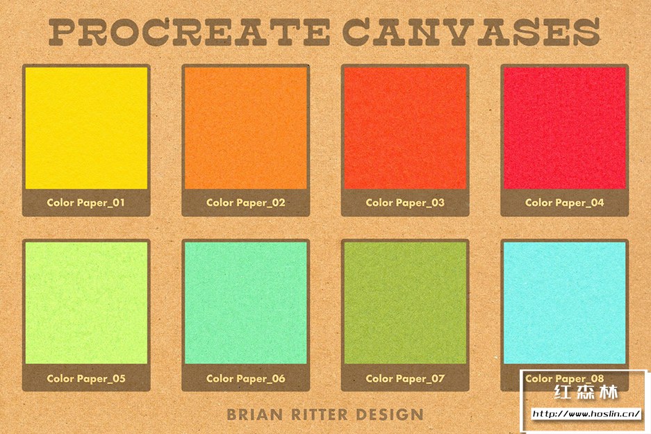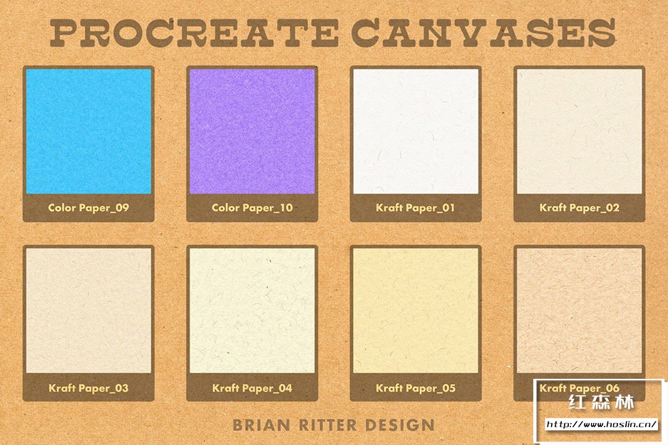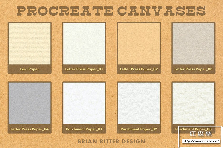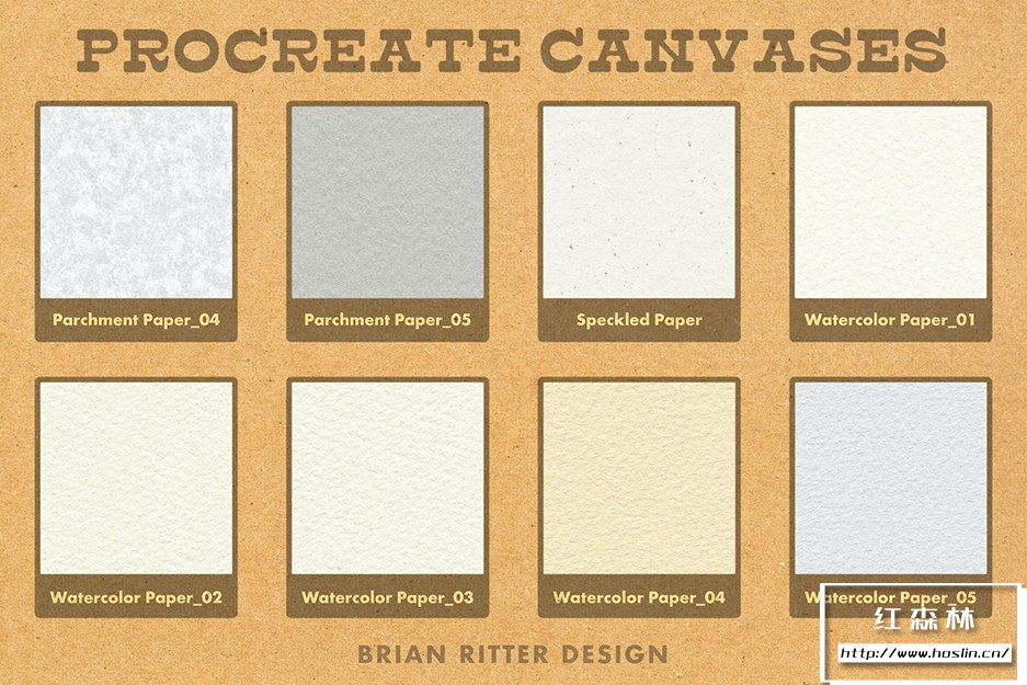 - 40 幅 Procreate 画布,包括彩色纸、牛皮纸、平纹纸、凸版纸、羊皮纸、斑点纸和水彩纸。