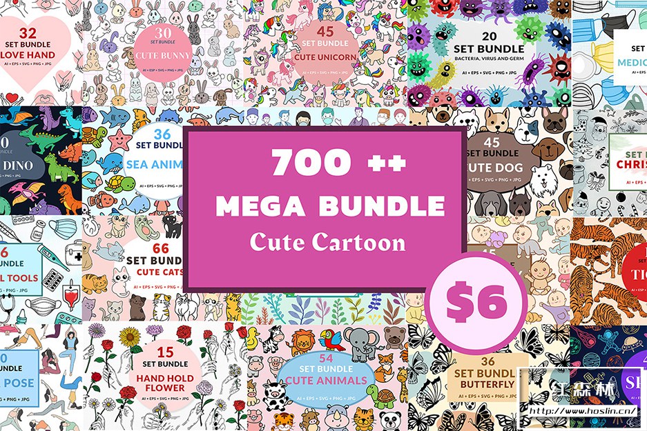 20大类,700+可爱儿童卡通绘画涂鸦素材包,文件格式包括: