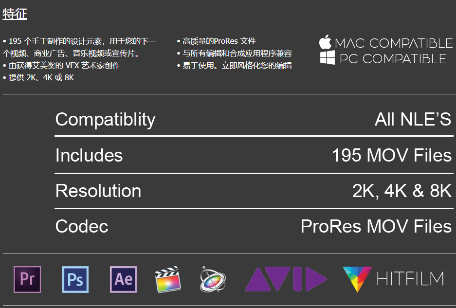 支持的软件有:Final Cut Pro,Final Cut Pro X,Apple Motion,Premiere Pro,After Effects,FCPX,Nuke,Smoke,Avid,Vegas,Edius,达芬奇等其他后期视频制作软件。