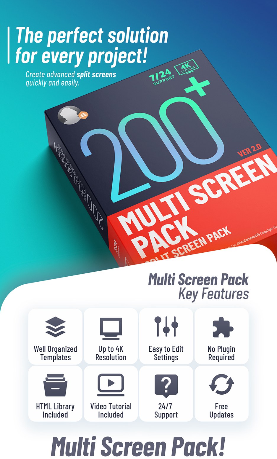 专业设计和动画布局。多屏/分屏包 模板可以以多种类型的形式使用;非常适合用于广告、旅游视频、房地产视频、婚礼电影、音乐视频、体育、烹饪、商业、广告、音乐视频以及其他任何内容!Multi Screen Pack是用于After Effects项目的独特模板。您可以在一个屏幕中显示多个场景。您也可以在场景中添加文本。只需将您的素材或图片拖放到合成中,然后自定义边框、颜色等。
