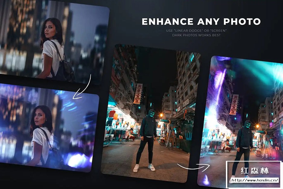 Neon Light Overlays V2 毫不费力地为您的照片添加深度!只需将我们的任何叠加层拖放到您的原始照片上方并更改混合模式即可。我们推荐“屏幕/滤色”或“线性减淡(添加)”模式,但这完全取决于您!