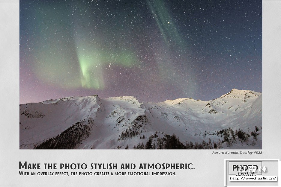 它们非常适合业余爱好者和专业人士。在彩色和黑白照片上表现出色。为了您的方便,在屏幕/滤色模式中添加了用于选择和覆盖叠加层的操作。这适用于 Photoshop 和 Photoshop Elements。北极光效果叠加可以在任何图形编辑器中使用,它支持屏幕/滤色模式下的图层叠加。