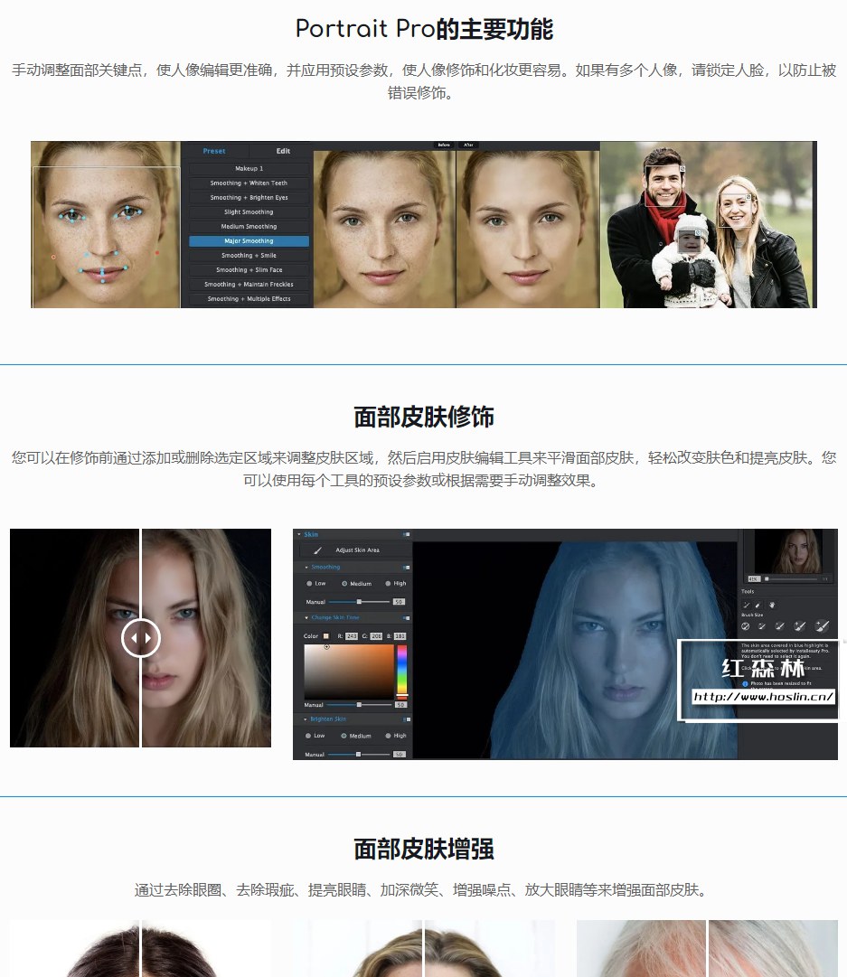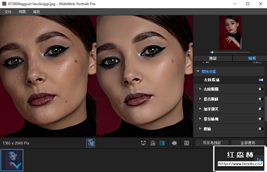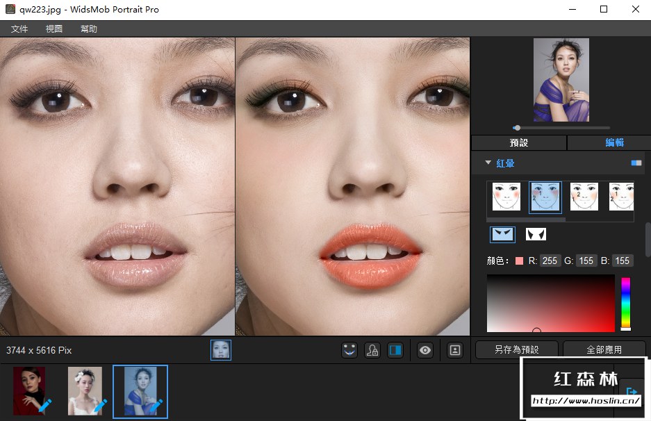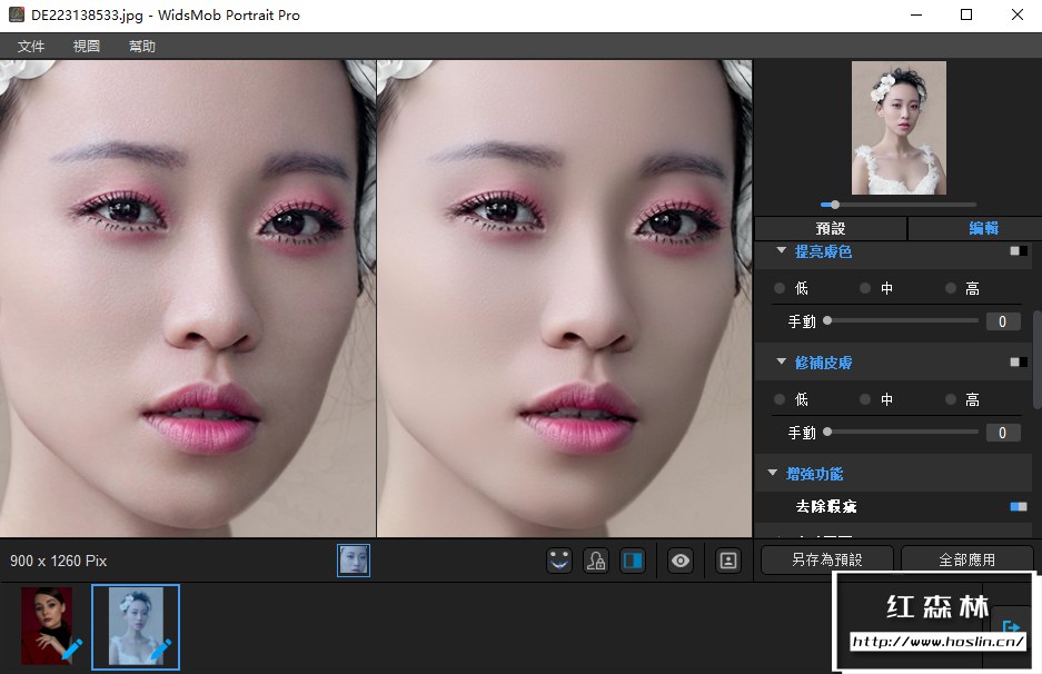 在 WidsMob Portrait Pro的帮助下,您可以管理皮肤、去除眼圈、去除瑕疵、提亮眼睛、加深微笑、提升脸颊、瘦脸、放大眼睛、增强鼻子、去除油光和美白牙齿。至于人像妆容,您可以调整腮红、口红、彩色隐形眼镜、眼睛颜色、睫毛、眼线、眼影等。