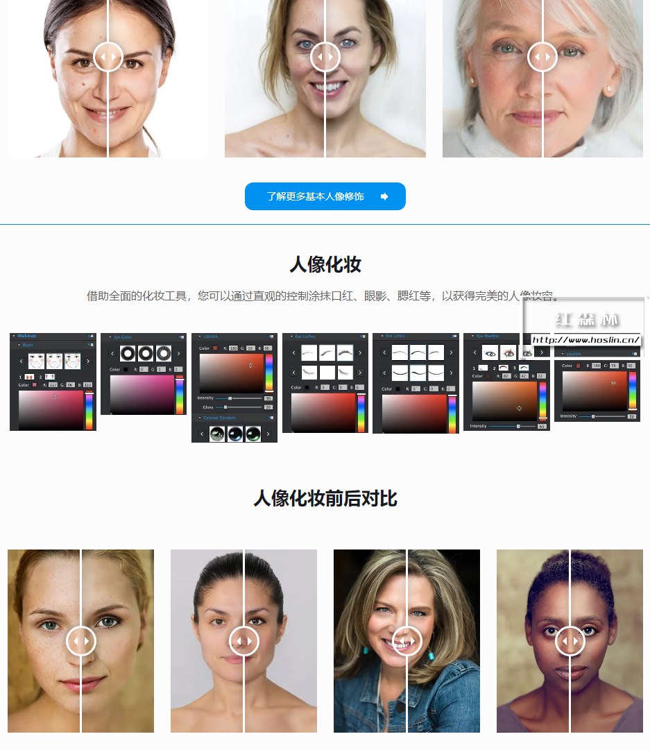 - 人像化妆:您还可以使用这款专业的人像编辑软件,通过腮红、口红、彩色隐形眼镜、眼睛颜色、睫毛、眼线和眼影来进行人像化妆,让您熠熠生辉。