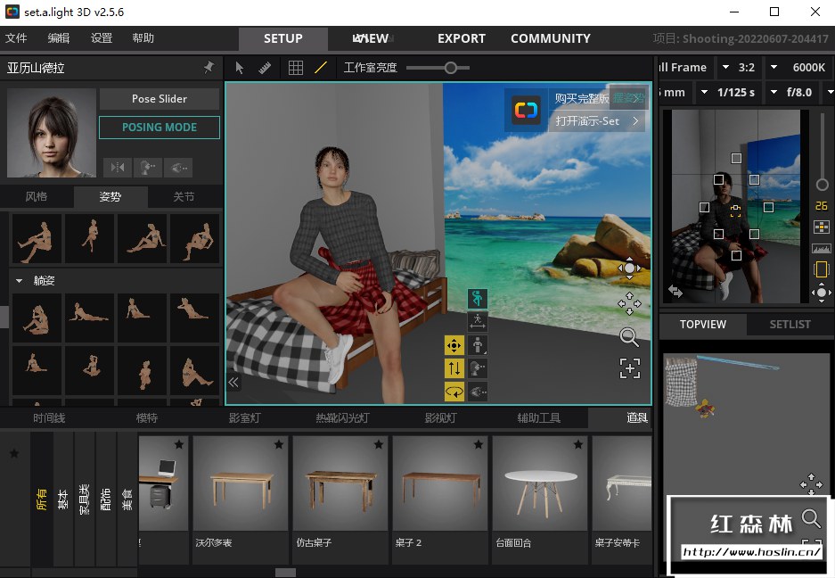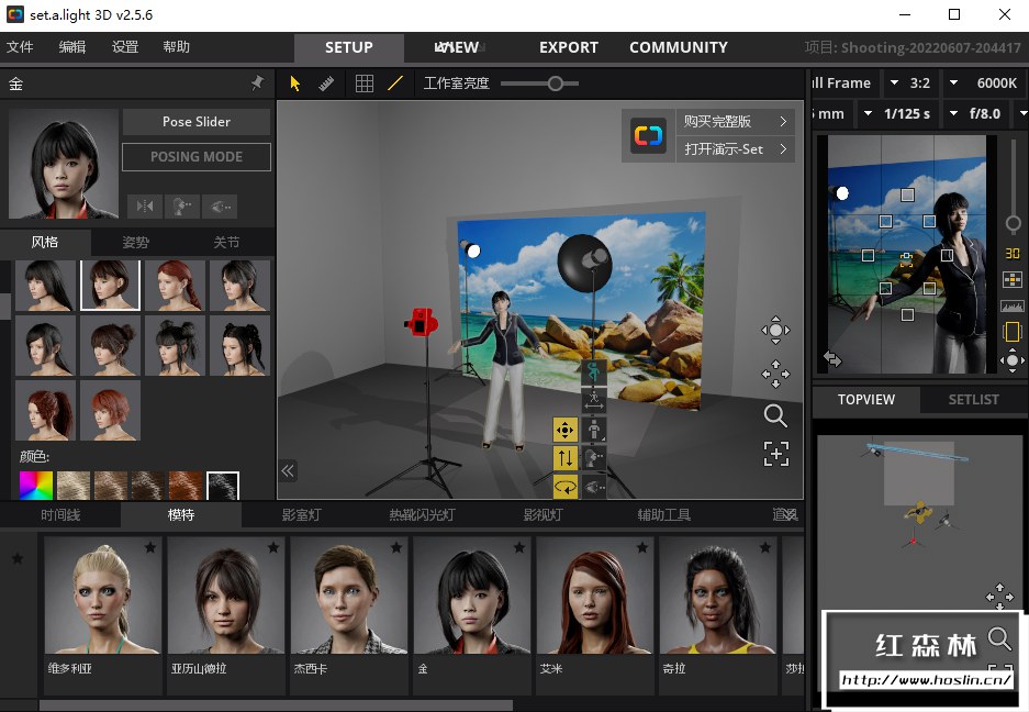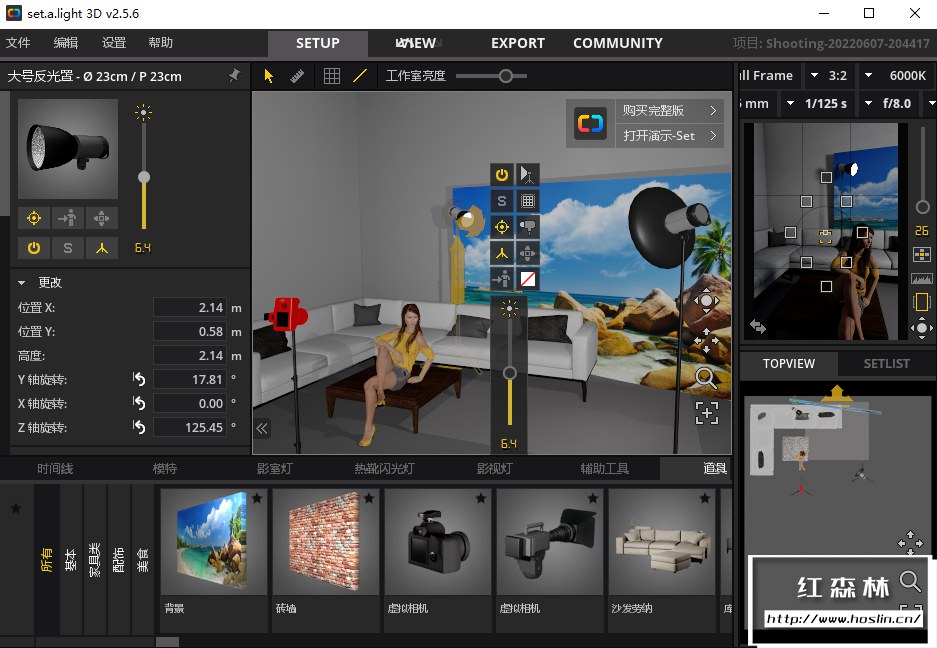 set.a.light 3D studio是一款功能全面3D室内摄影布光软件,内置了多种虚拟模型角色供用户自由选择,主要为帮助摄影行业的工作用户在进行3D室内拍摄的时候,完成对灯光的位置进行设置,可以自由布置摄影棚设备位置,调整视角以达到满意的拍摄效果,而且含有众多闪光灯、电影灯以及配件配件可以让刚接触闪光灯的摄影爱好者不需购买昂贵的器材,用电脑即可直观的了解每种影室灯以及配件的作用。该软件不仅支持对各种灯光的道具摆放位置,灯光的反射位置等进行调整,还支持对效果进行立即的显示,这样就能根据用户来的需求来完成相关的效果添加,不仅如此,甚至模拟出了一个完整的照相馆,包含了组装灯组所需的一切,还能够找到50多种不同的硬和软光整形器,并且可以与蜂窝和附件相匹配,功能非常强大。