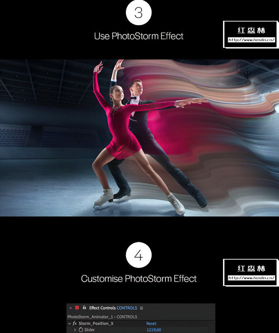 图像拖尾流动视觉特效动画模板 PhotoStorm Animator,支持AE和PR。可以为你的照片添加各种绚丽多彩的运动拖尾特效。使用过程非常简单,只需在AE或PR种导入您的照片,使用AE或PS绘制遮罩,并保存Alpha通道,使用模板效果控件自定义您的拖尾特效,渲染合成即可导出。