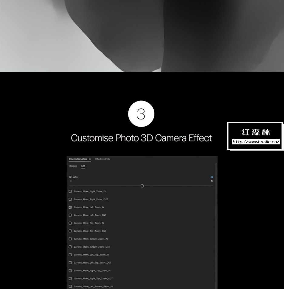 Photo 3D Camera Animator 照片3D动画师,支持PR和AE软件,可以为你的静态照片转换为运动的三维摄像机移动视差动画特效。使用过程非常简单,导入您的照片,在PS或AE中中制作蒙版照片 (导出为带有 Alpha 通道的PNG),通过效果控件调整自定义3D效果,然后渲染合成即可。包含视频教程。