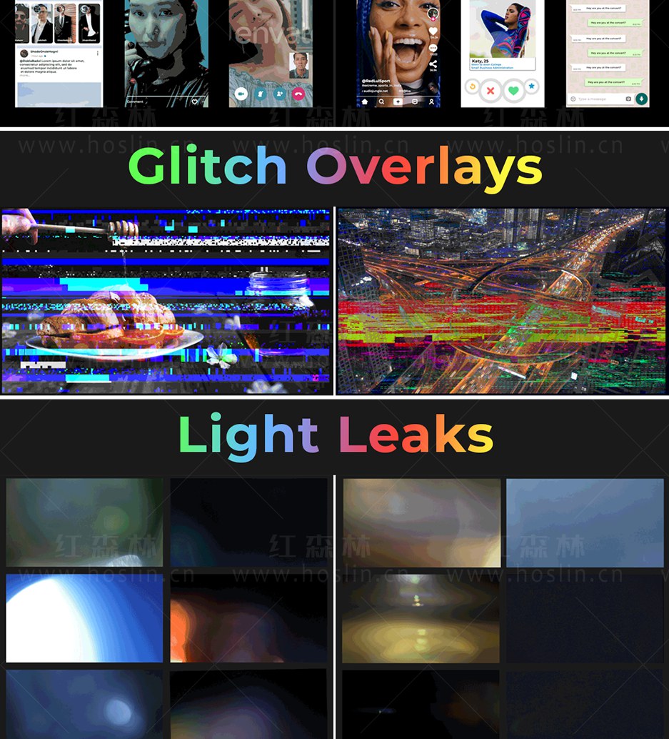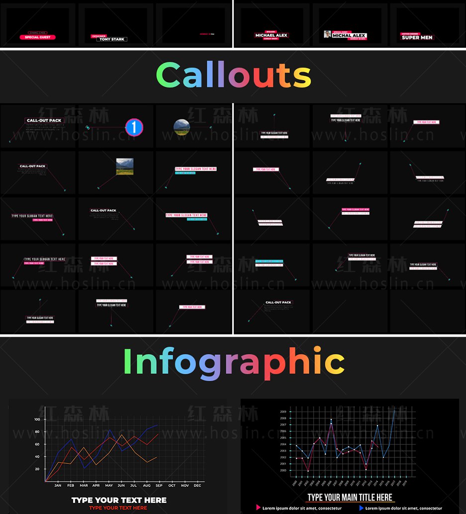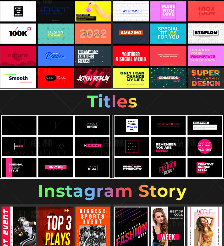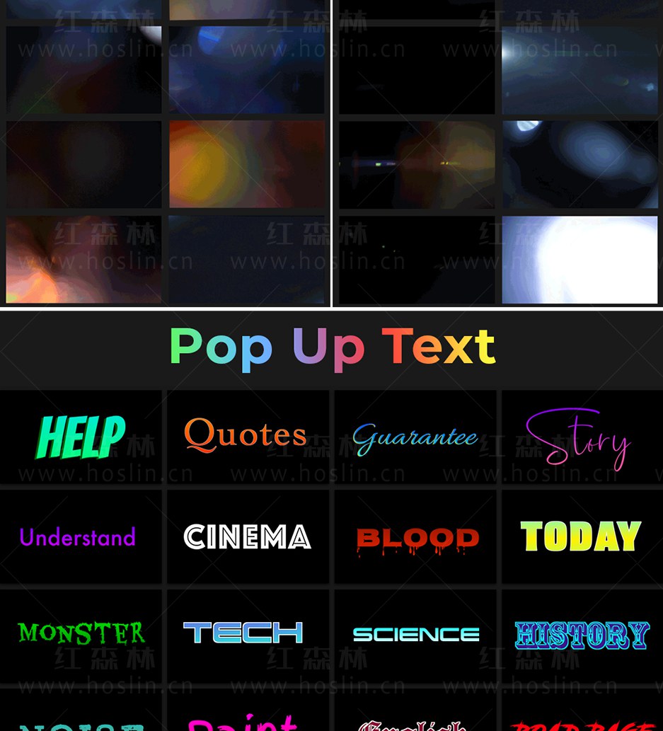 Super Creators Pack 提供超过5000个效果预设元素,如文字标题动画,社交媒体,无缝转场,指示线动画,封面海报设计,图形动画,LUTS调色预设,视觉特效,音效,视频素材等。支持中文输入,可修改大小位置颜色等属性。