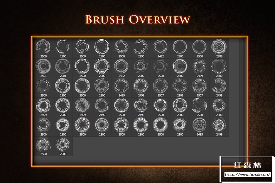 在本产品中,您会发现52 种复杂的未来圆形画笔,格式如下: