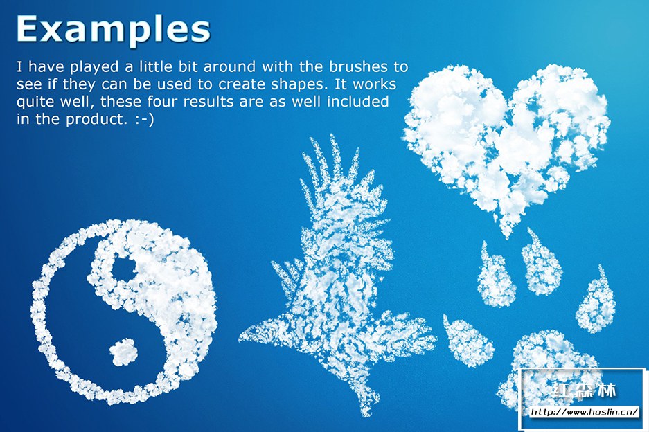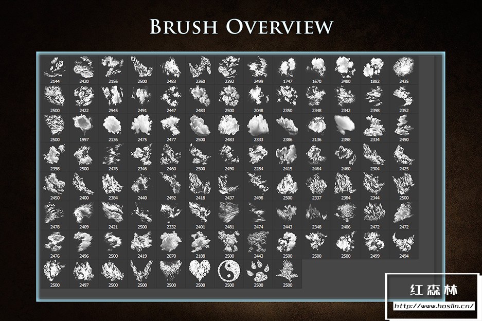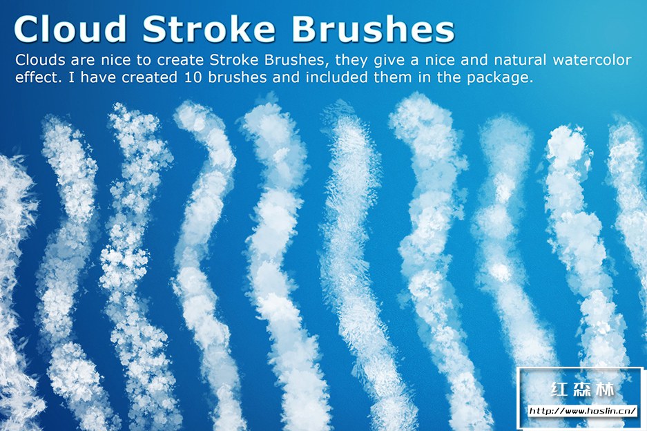 在此产品中,您将找到以下格式的 100 个云彩画笔和 10 个额外画笔: