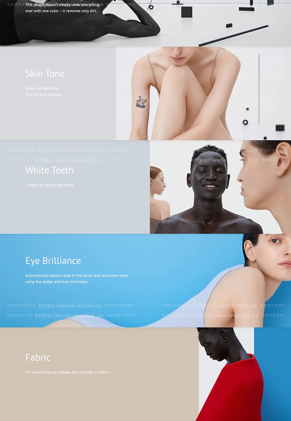 大名鼎鼎的3D LUT CREATOR团队开发的AI智能人能磨皮美容软件Retouch4me系列,现在一共有九款软件。这是一套基于神经网络的人像照片快速精修工具,它功能强大,内置了包括Portrait、Dodge Burn 、Clean Backdrop等九个人像修饰插件,基本上涵盖了人像处理中的方方面面:光影、磨皮、去瑕疵、美白等效果一应俱全。同时它基于神经网络,使得操作简单易上手,是一套备受推崇的经典插件。还有一套AI磨皮PS动作,共包含: