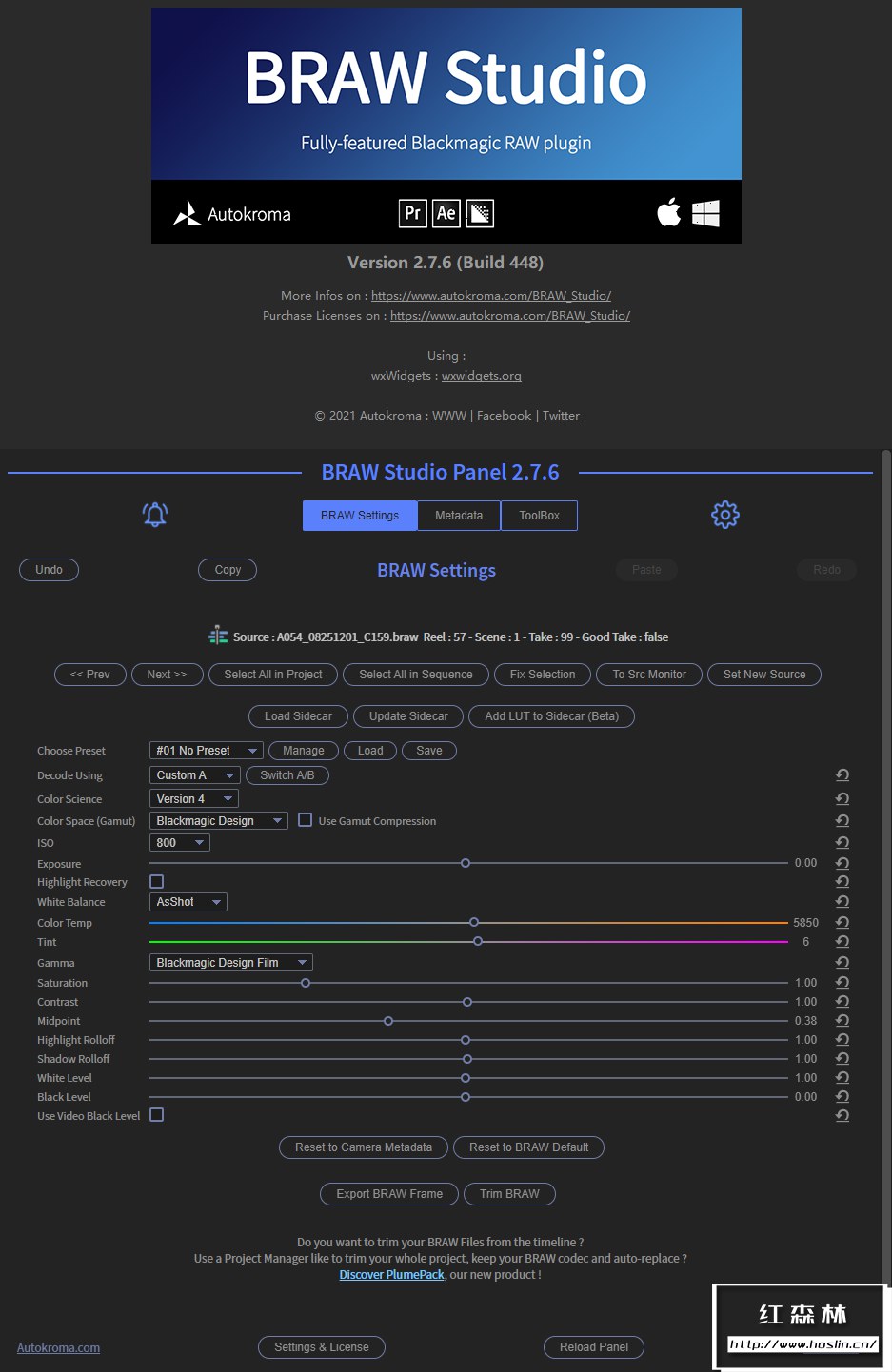 BRAW Studio是一款适用于Adobe Premiere Pro和Media Encoder的全新Blackmagic RAW(.BRAW)素材导入器!使用这个插件可以将Blackmagic RAW(.braw格式)的素材直接导入到After Effects, Premiere Pro 和 Media Encoder软件中,还可以进行一些参数的设置。