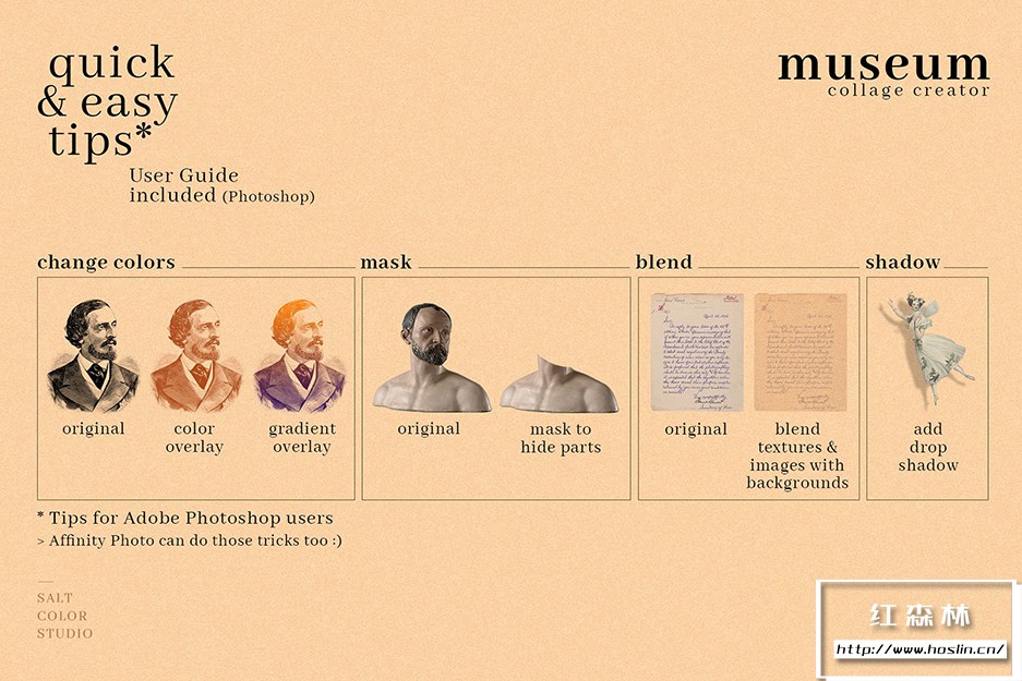 最后但同样重要的是,我们制作了10 个预制拼贴画,您可以根据需要使用或自定义它们!它们以 PSD 格式提供,因此请确保您拥有 Adobe Photoshop、Afinity Photo 或任何与 PSD 文件格式兼容的软件。