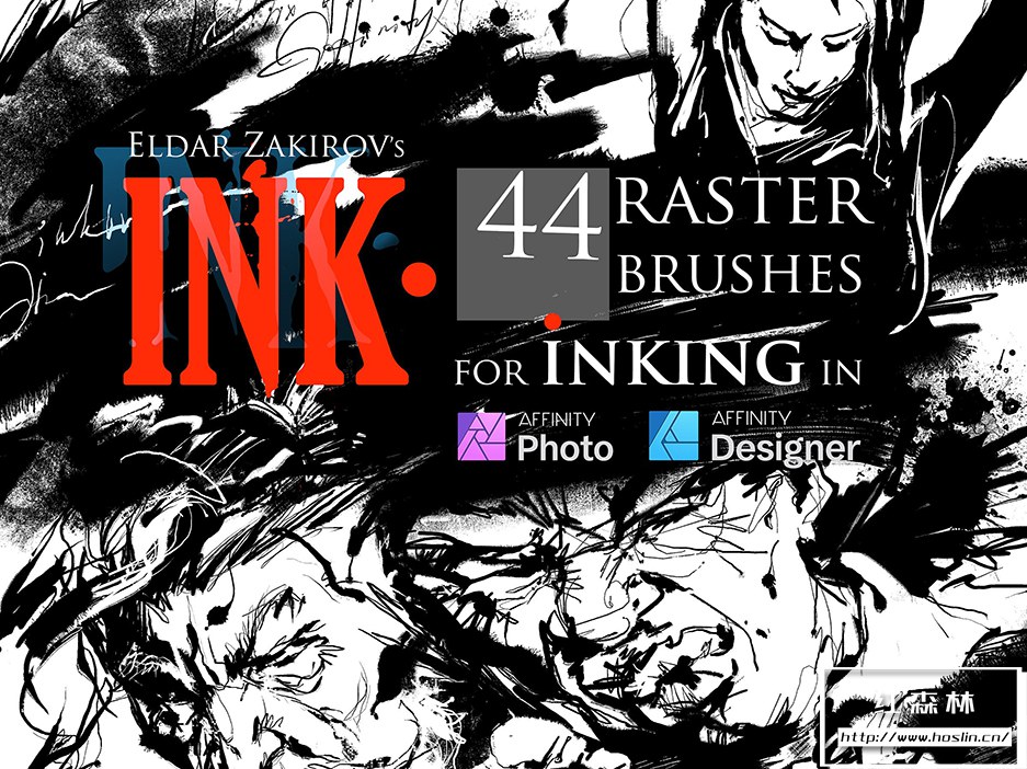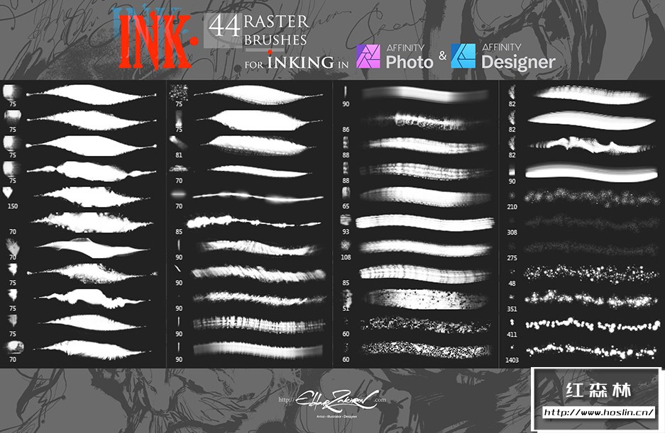 - 1.保存在“ INK. by EldarZakirov 2016-2018.afbrushes ”文件中的 44 个 Affinity 光栅画笔;