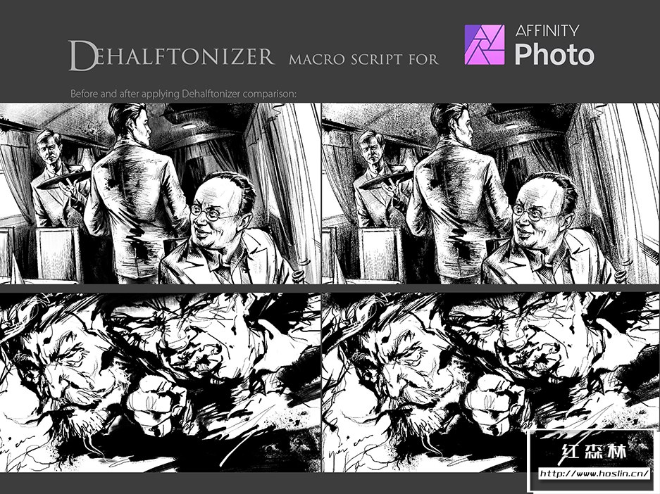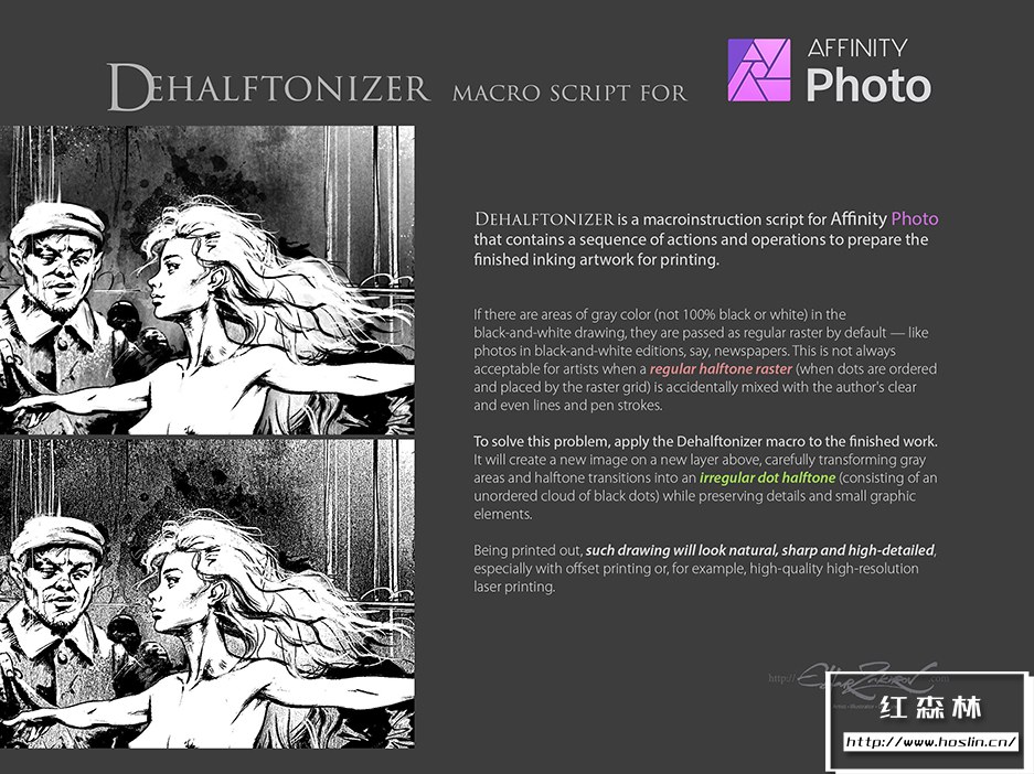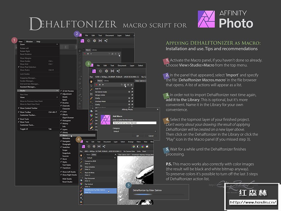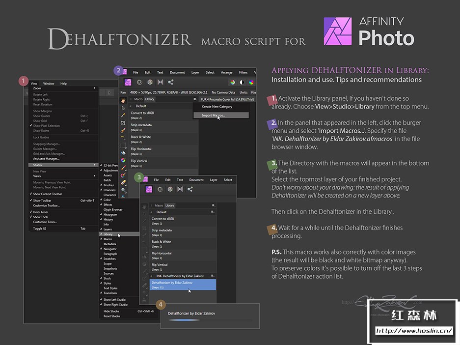 - 3. 墨水。Eldar Zakirov.afmacros 的 Dehalftonizer。将灰色区域转换为带有 100% 黑色或白色以进行打印的点状半色调的宏操作保存为库宏。这是一个比前一个更方便的选择。