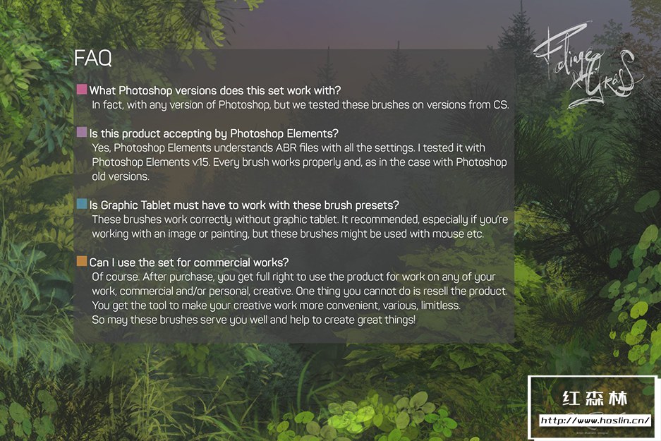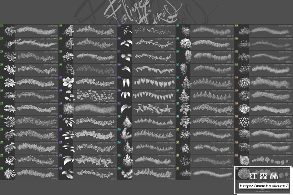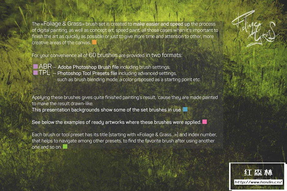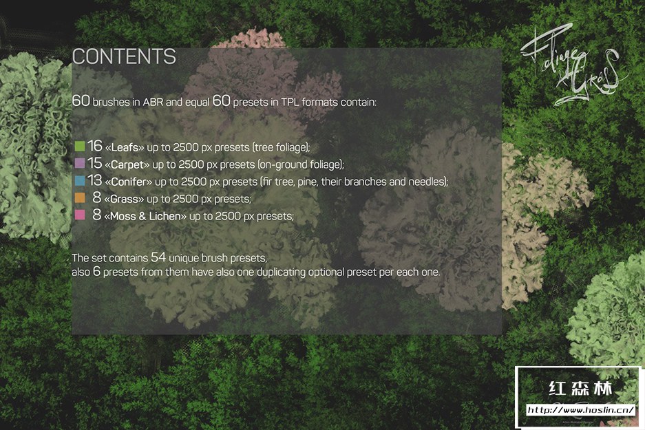 关于产品:Foliage & Grass 是60 种画笔,具有 ABR和TPL格式的Adob e Photoshop、Photoshop Elements、Adobe Fresco设置