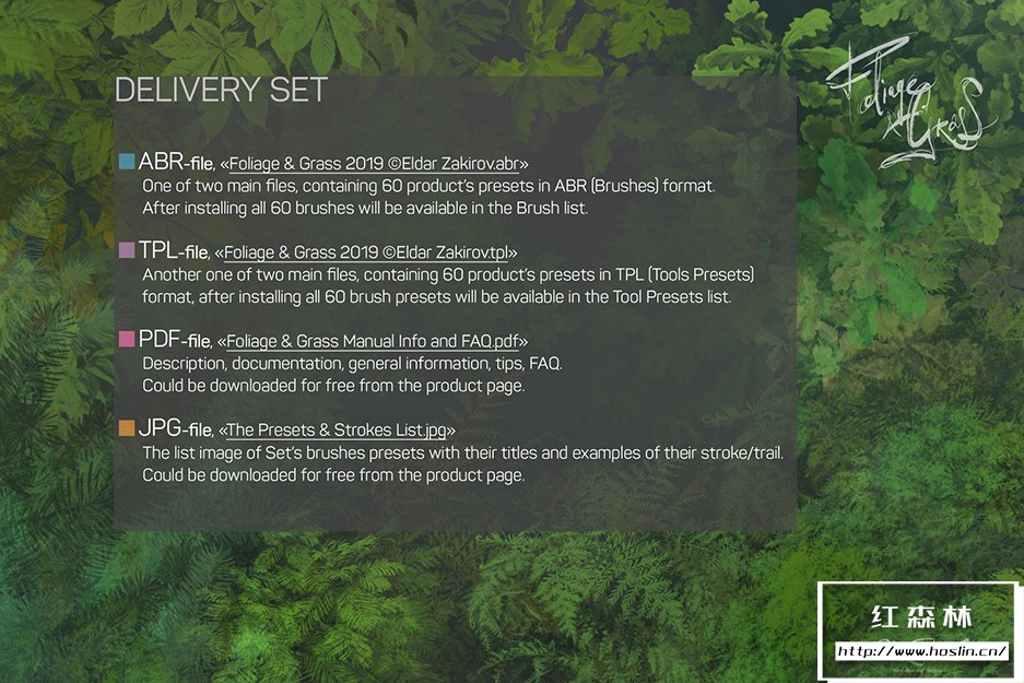 - 1. ABR 文件,« Foliage & Grass 2019 ©Eldar Zakirov.abr »,两个主要文件之一,包含 ABR(画笔)格式的 60 个产品预设,安装所有 60 个画笔后,画笔列表中将可用。