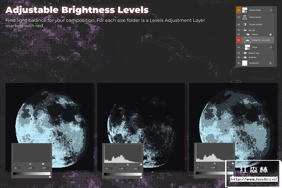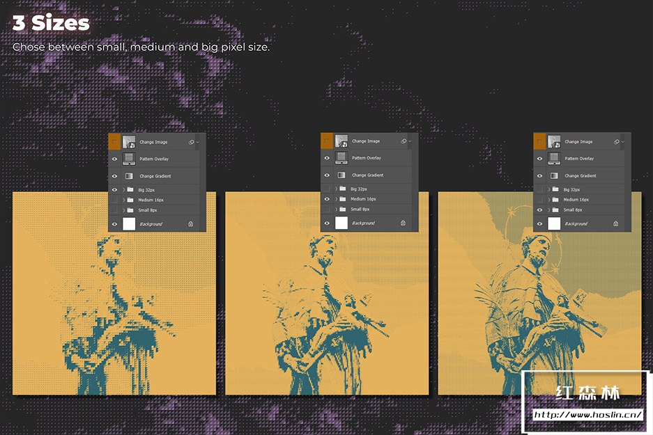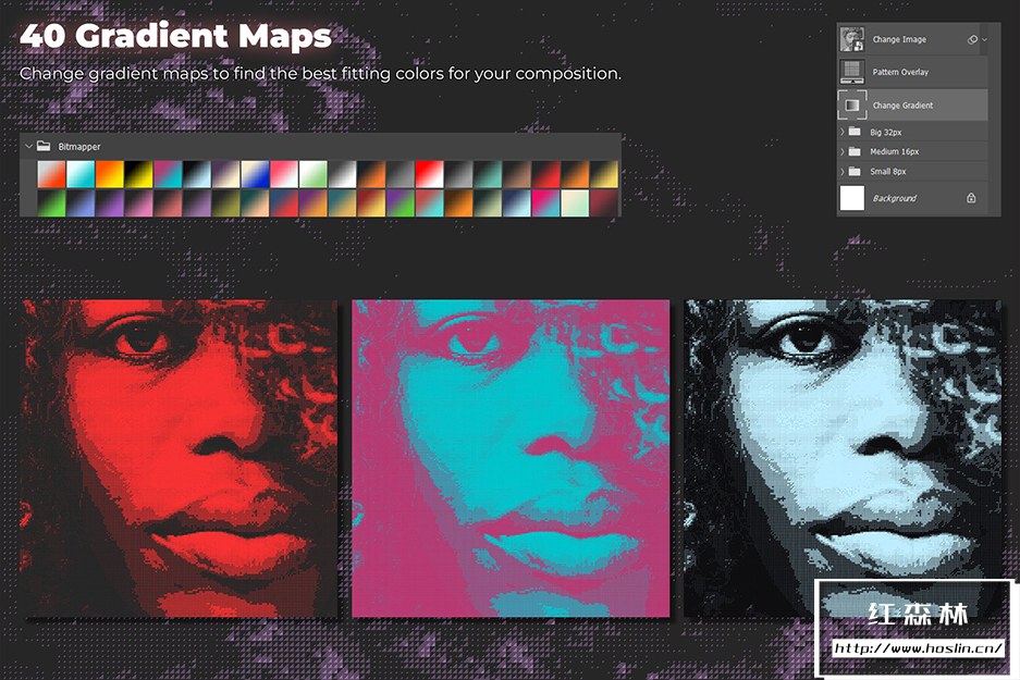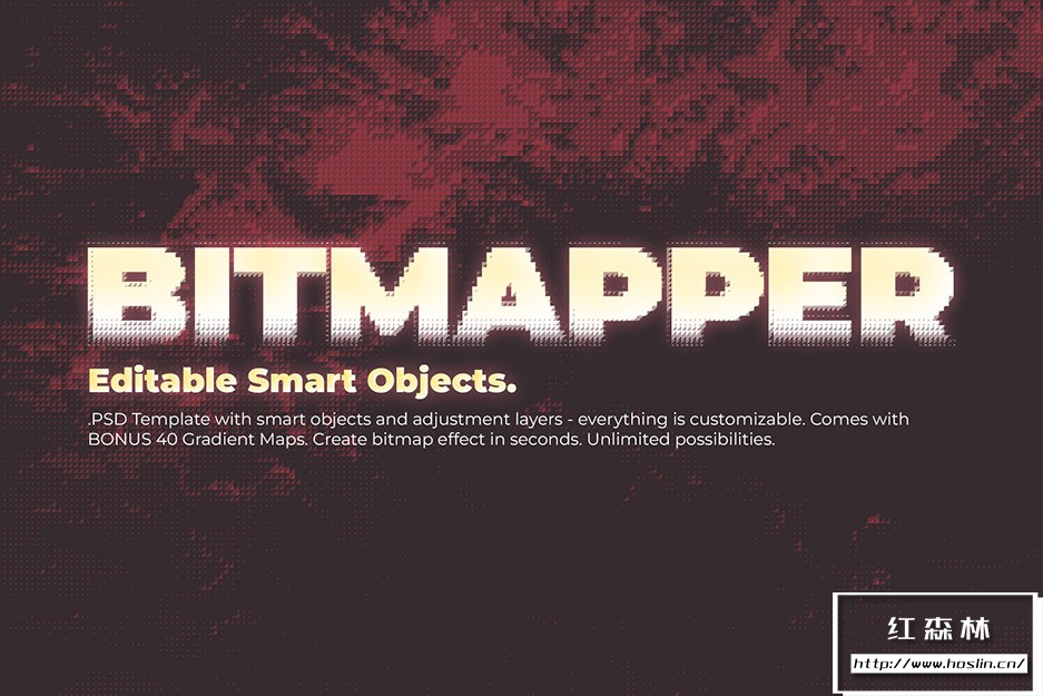 与其他类似产品不同,这不是一个动作包,它是一个带有可编辑和可调整图层的真实 Photoshop 模板。它不只是将您的图像从灰度转换为位图,它还会在智能对象上创建位图效果。您可以自由地尝试颜色、光线、尺寸,以获得您想要的效果并控制整个过程。