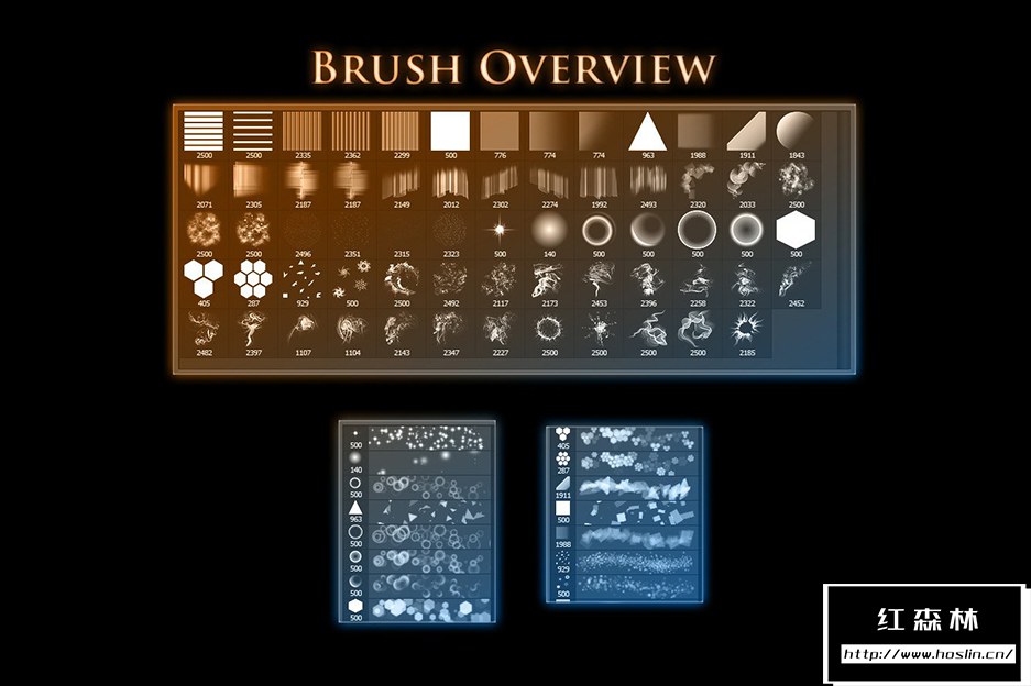 这个画笔包包含各种类型的高分辨率画笔,我经常使用这些画笔对图像进行一些照明: