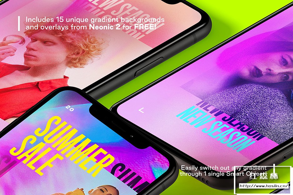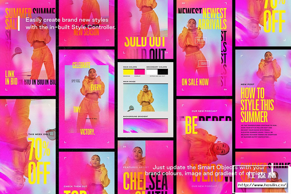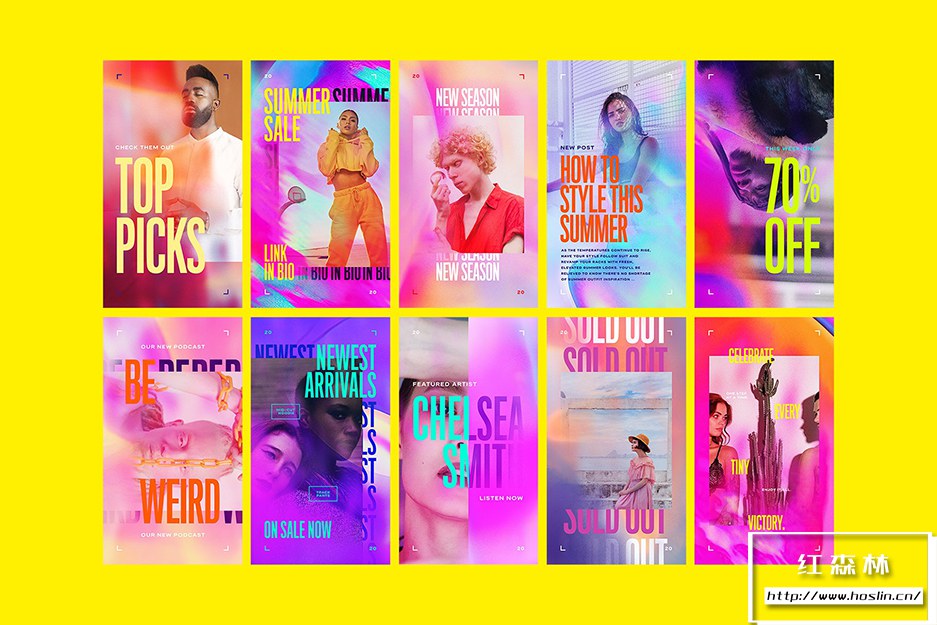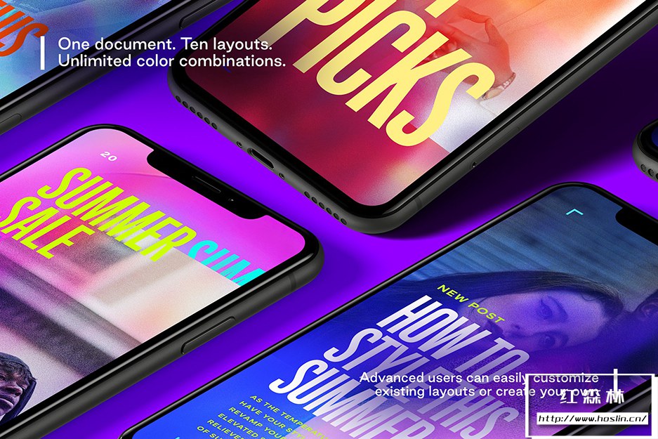 得益于PhotoShop的样式控制,Neogram 包括 10 种独特的布局、15 种生动的有机渐变和数百万种颜色可能性。