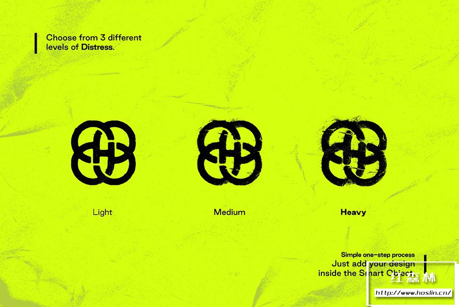 Distress 是一种简单的一步式文本处理过程,可添加纹理、半色调和失真。Distress 拥有 3 级损坏 – 轻、中和重 – 所有这些都在一个可自定义的 .PSD 文件中。
