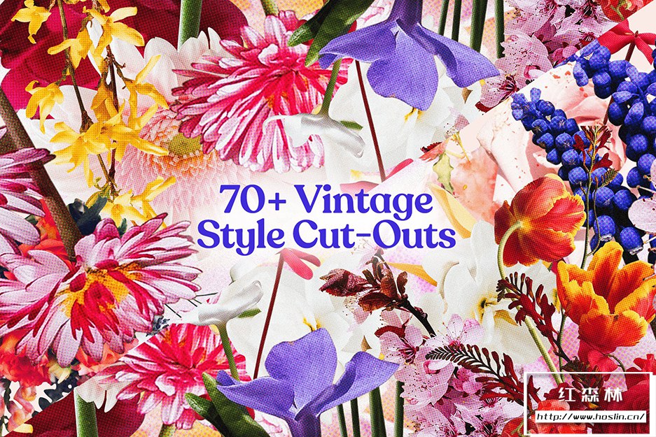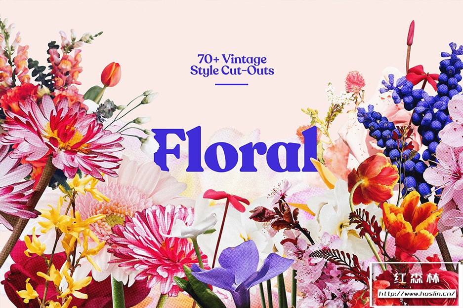 Floral 是一套拥有 70 多种高分辨率复古风格花卉PNG剪贴图像。每个文件都具有逼真的半色调和颗粒效果,适合复古杂志外观。