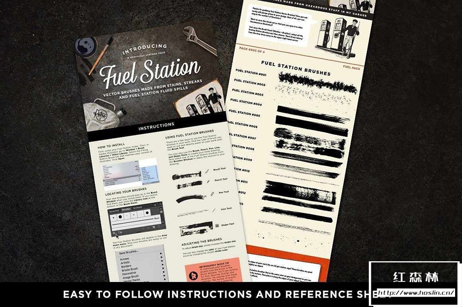 Fuel Station Illustrator Brush Pack 包括 20 个在我的车库中用旧机油、旧油漆和其他车库用品制成的带污垢的刷子,非常适合将 Illustrator 中绘制的图形变成肮脏的线条(不超过顶部)。Fuel Station Brushes 可以使笔触更大,并使用它们为矢量图添加粗糙的阴影和填充。使用它们在东西的边缘周围添加仿旧纹理(将画笔设置为与背景相同的颜色,以保守地在边缘使用)。选择其中一种飞溅笔刷,并在您的作品中喷出微妙的墨水喷雾,以达到邋遢的画龙点睛之笔。
