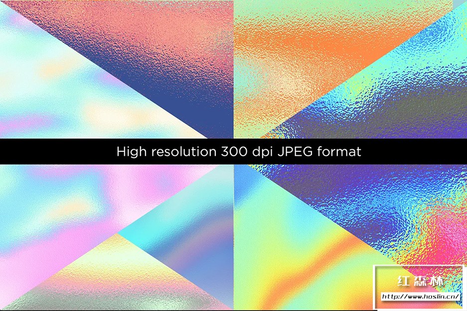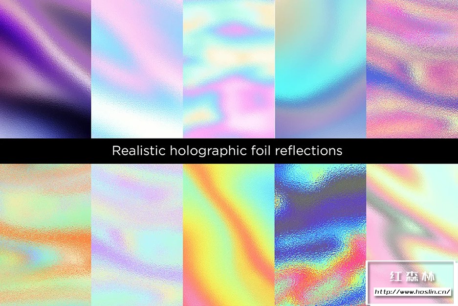 20 种闪闪发光的彩色全息箔纹理,具有逼真的光反射和纹理。JPG 文件适用于大多数图形软件。