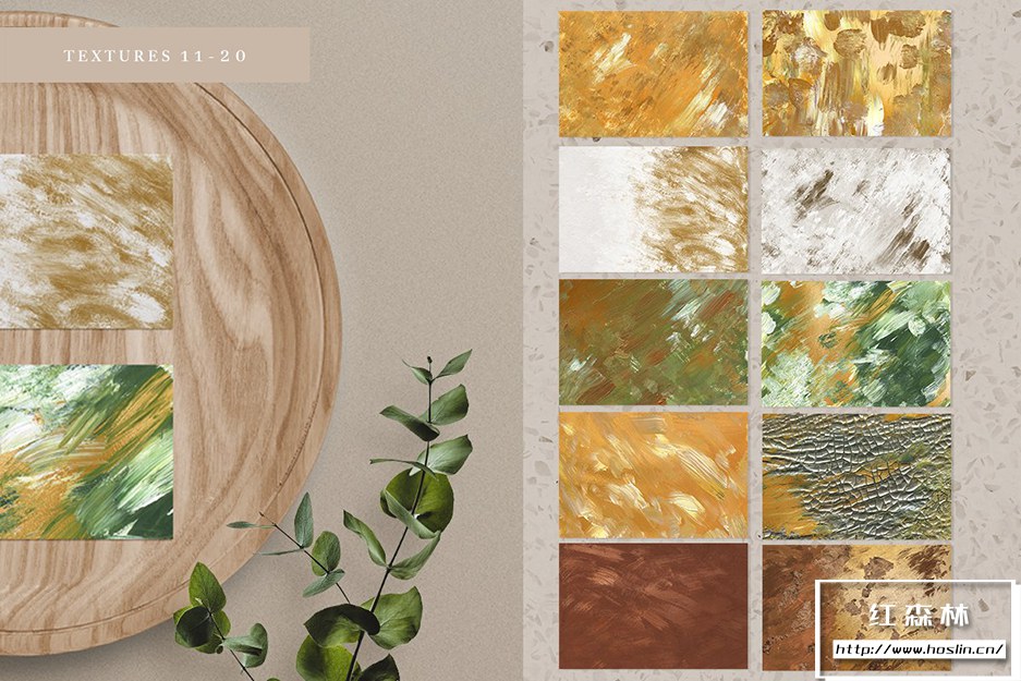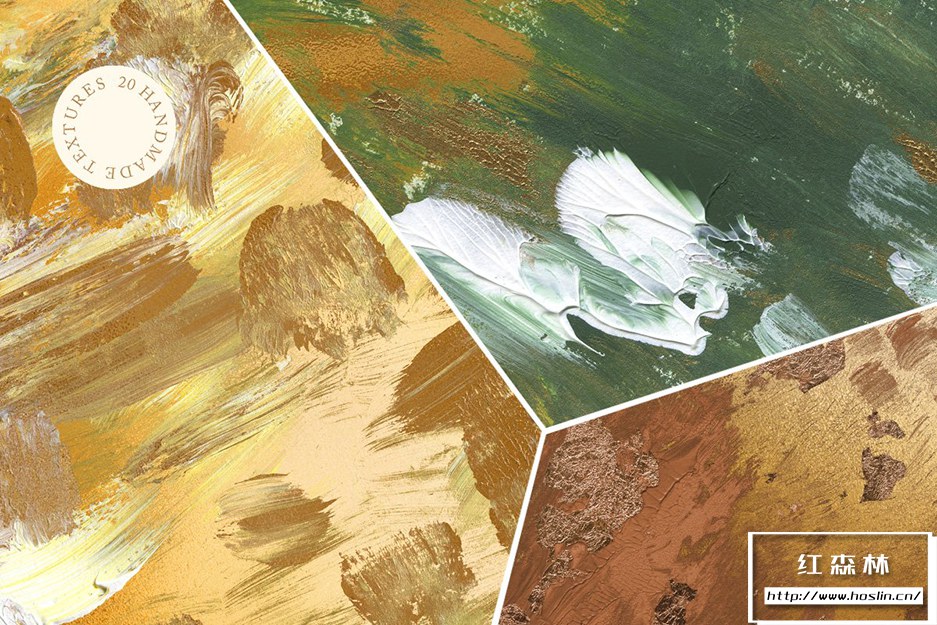 20 种Golden Spring 丙烯酸演练涂抹纹理- 所有画作均由手工精心制作,以高分辨率扫描,然后进行数字处理。