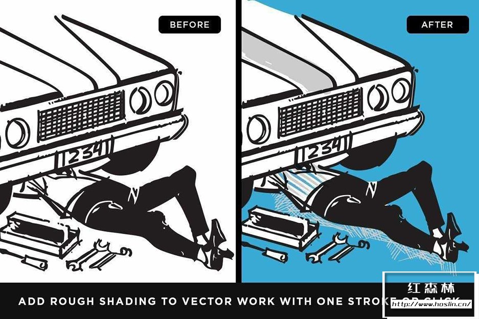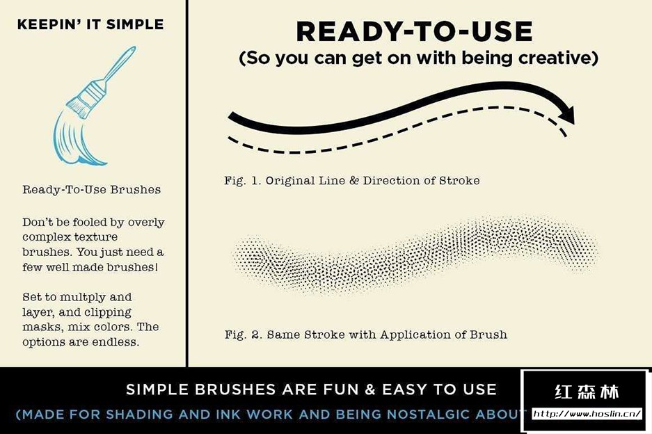 - 20 种矢量艺术画笔,包括半色调干涉图案、手工交叉影线、水彩画、涂鸦填充物和墨水画笔