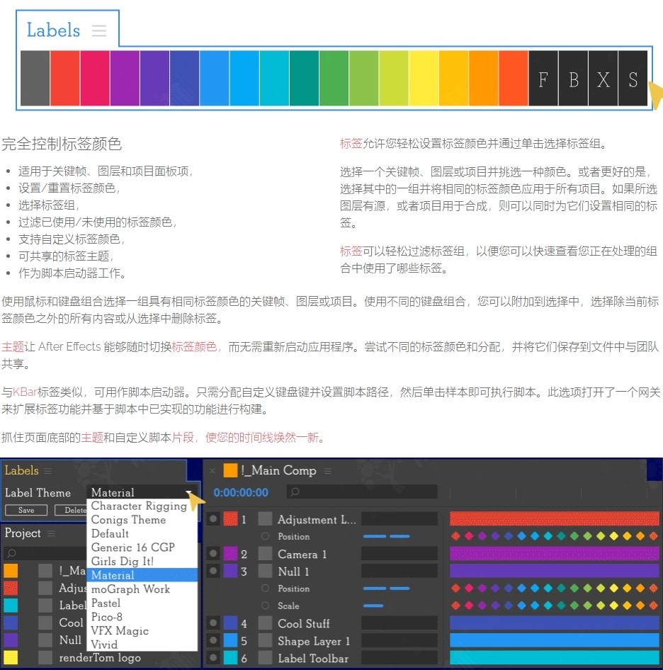 在AE中制作项目的时候,当合成中的图层增多,要快速寻找图层会变得很繁琐。为了给图层区分开,我们一般是给图层贴上颜色标签来区分,使用 Labels 这个脚本可以自定义颜色组来管理图层/图层标签颜色,这样就可以在多图层的时候查找和选择想要的图层,让工作变得更容易。适用于关键帧、图层和项目面板项。