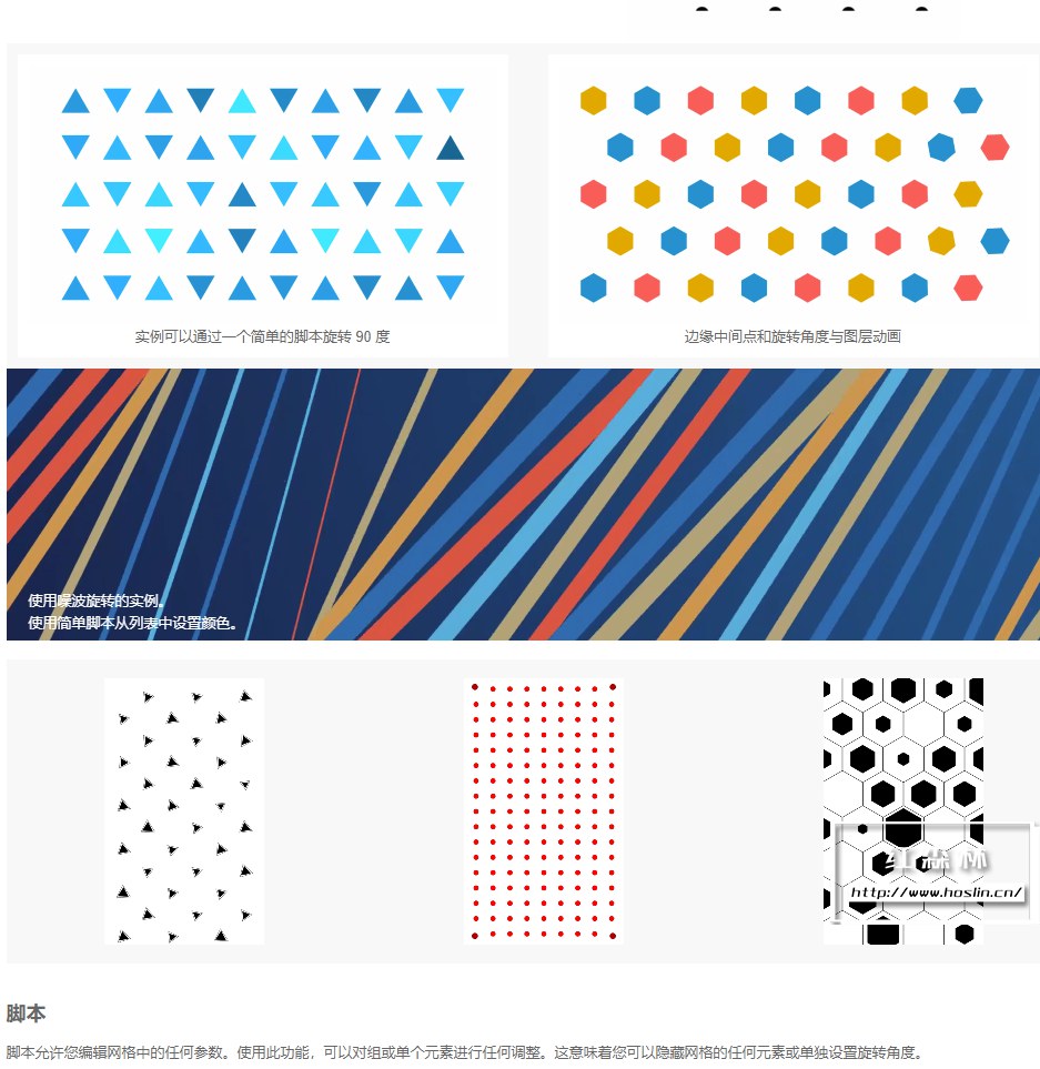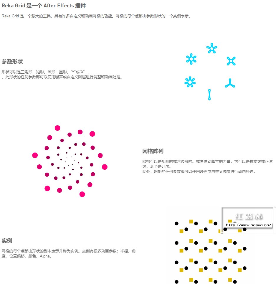 - 网格阵列:网格可以是规则的或六边形的。或者借助脚本的力量,它可以是螺旋线或正弦线,甚至是叶序。此外,网格的任何参数都可以使用噪声或自定义图层进行动画处理。