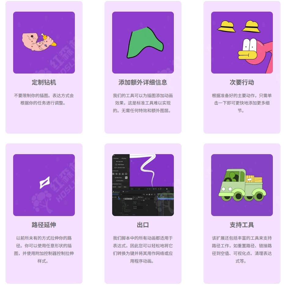 我们准备了一套工具来处理 Path。它们有助于制作壁球和拉伸、波浪动画、辅助动作等。绑定工具有助于连接准备好的插图,这是其他经典工具无法实现的。脚本使用两种类型的动画。循环动画无需任何键即可工作,直接在路径内创建。因此,使用几个滑块,您可以更改完整的动画。半自动动画为您准备好的插图添加辅助动作。这些功能将加快您的工作流程并扩展可能性。