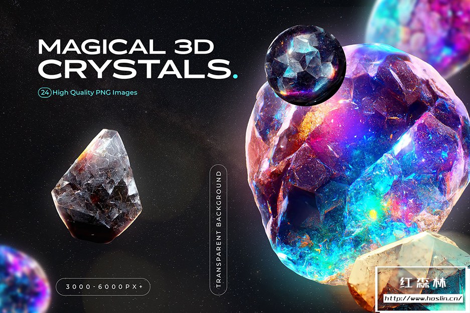 我们推出的 3D 宝石和水晶系列,包含 24 颗色彩鲜艳的神奇宇宙宝石。这些超现实元素是网页设计、海报、品牌、图案等等的重要资产!