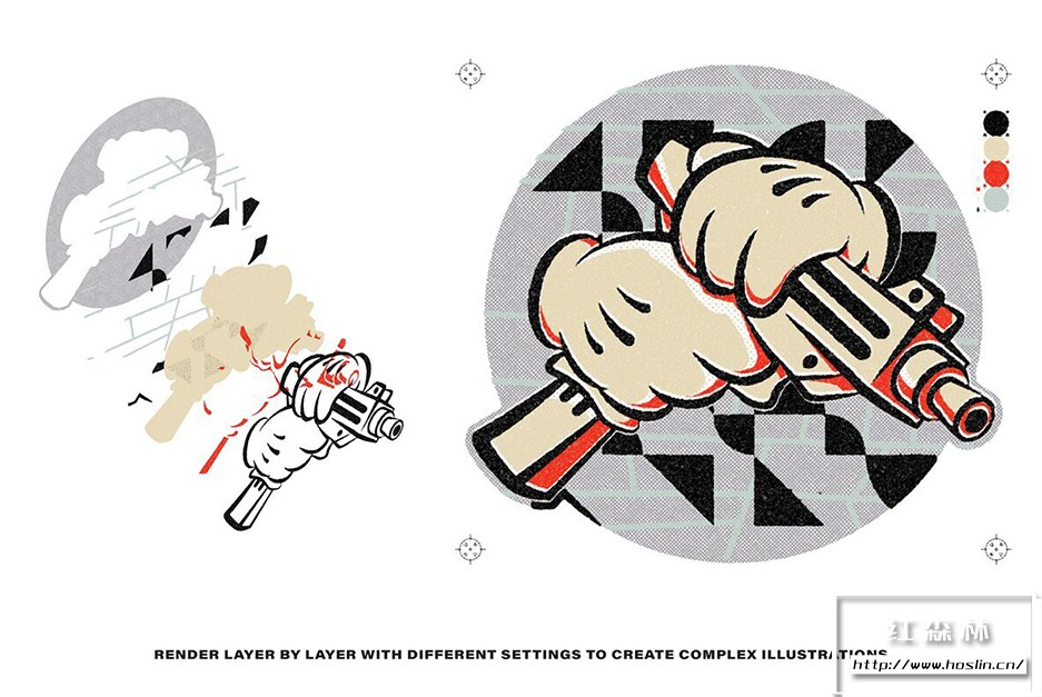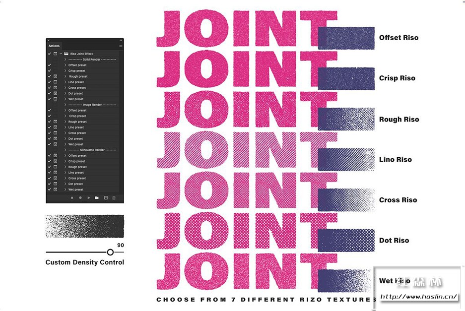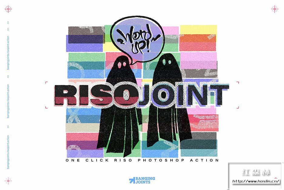RisoJoint Action 让您立即获得 Risograph 打印效果!它带有重复渲染功能:一遍又一遍地播放动作以扭曲边缘出血效果。另一个标志性的接缝细节 – 您不必加载任何图案、图层样式或链接置换贴图。该动作基于本机程序 Photoshop 滤镜,只需加载一个 .atn 文件,您就可以开始了。立即使用它,打造完美完美的印刷效果!