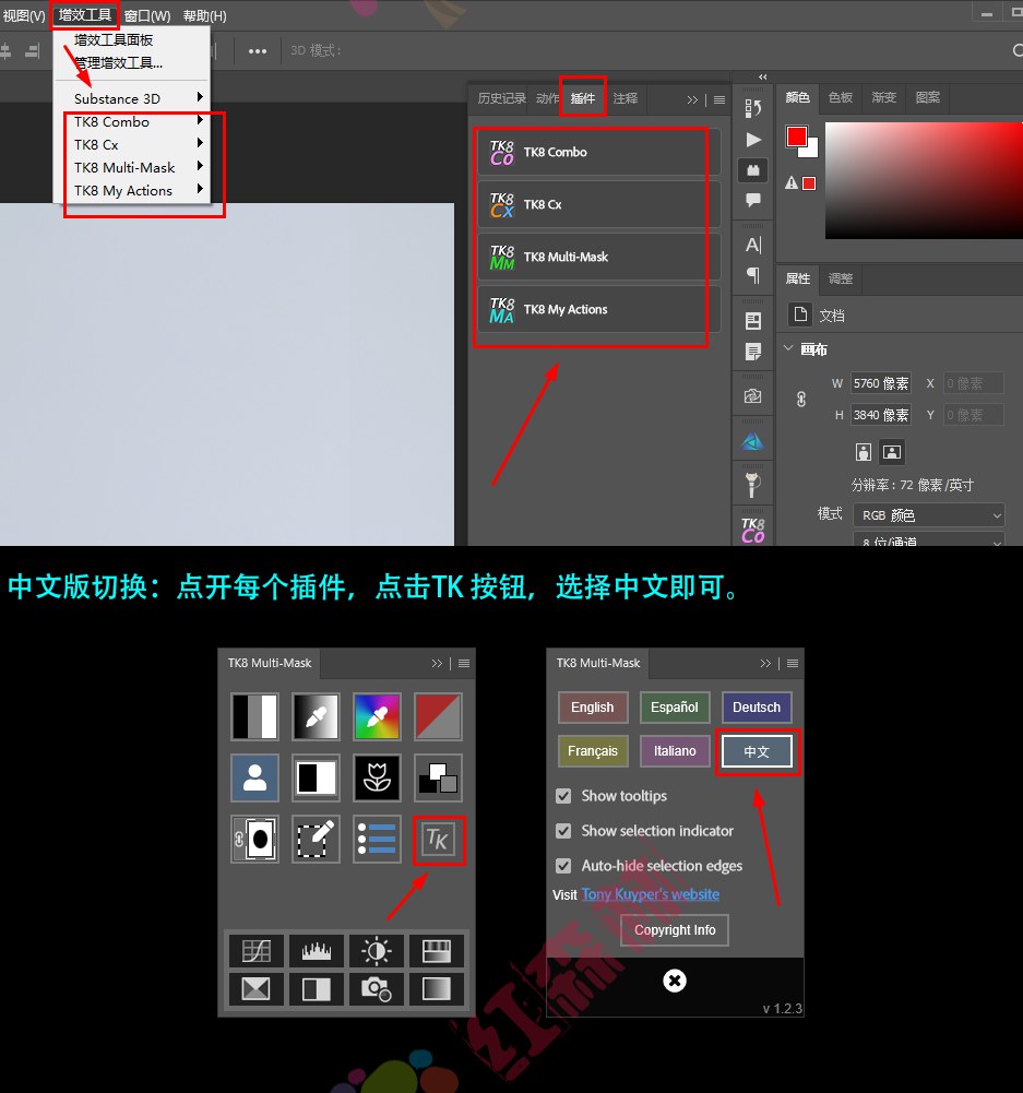 插件支持:TK8插件使用Adobe新的UXP架构,运行V1.2.3 需要 Photoshop 2022 版本 23.2.0 或更高版本。