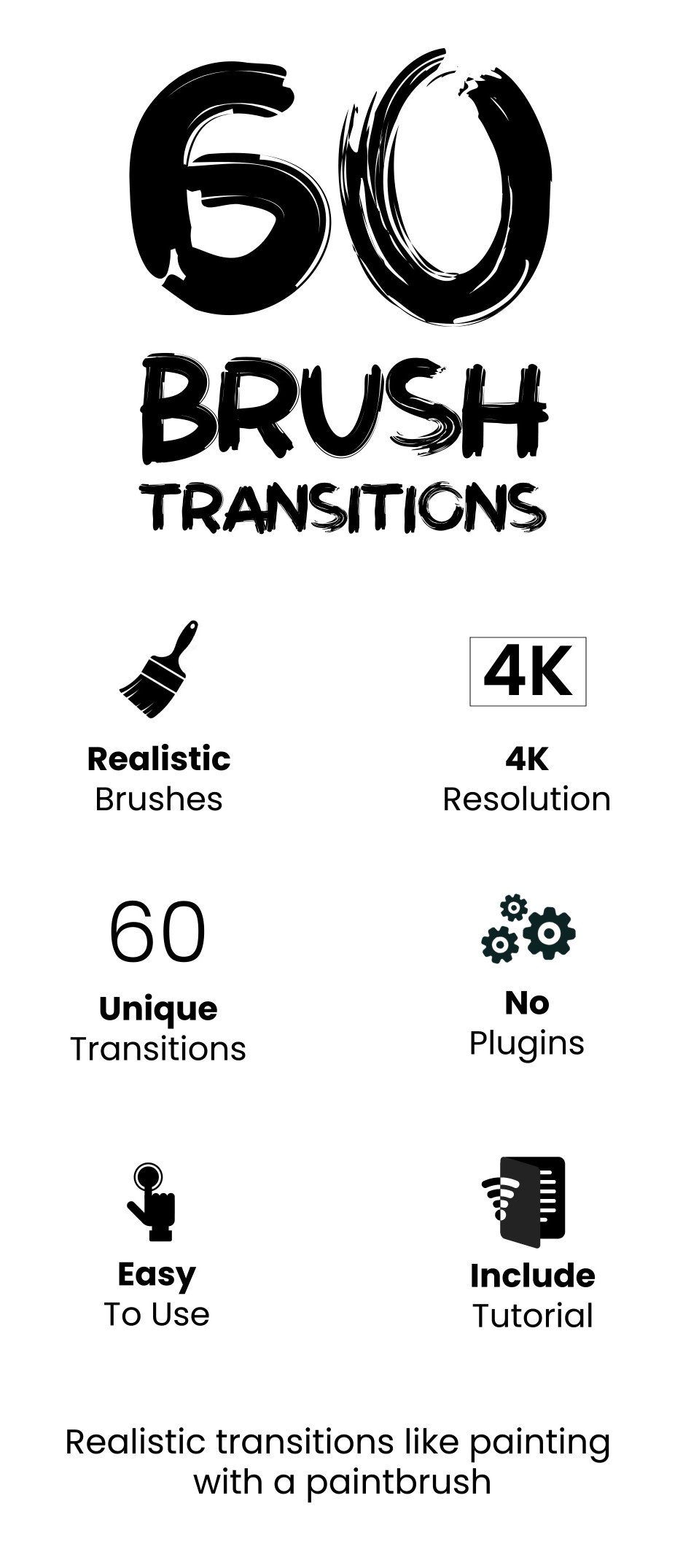 60个独特逼真的画刷画笔转场过渡,4K分辨率,适用于图像或视频,渲染快速,即使是初学者也很容易使用。适合您的任何项目,包含视频教程,无需插件。