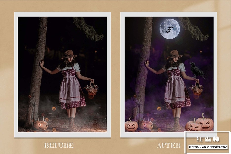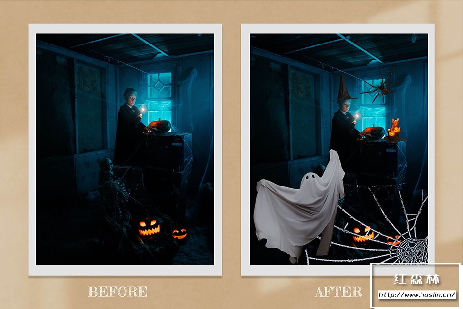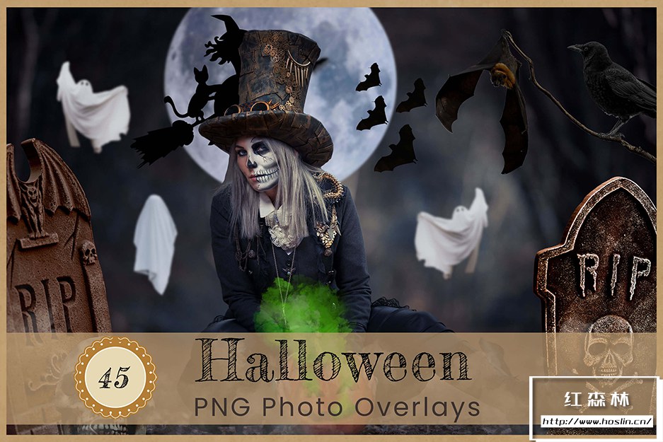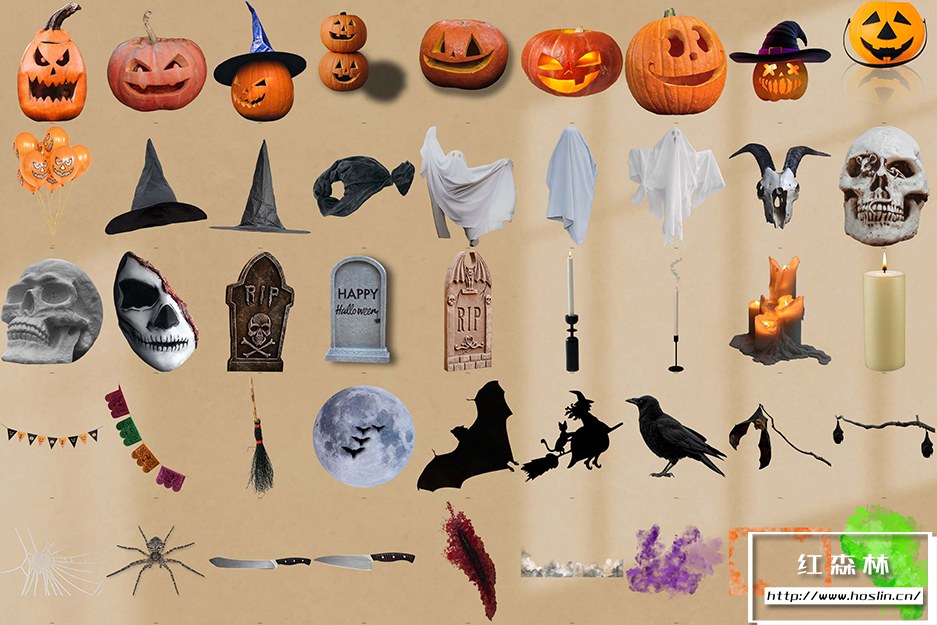 万圣节 Photoshop 叠加包包含 45 个透明 PNG 文件。