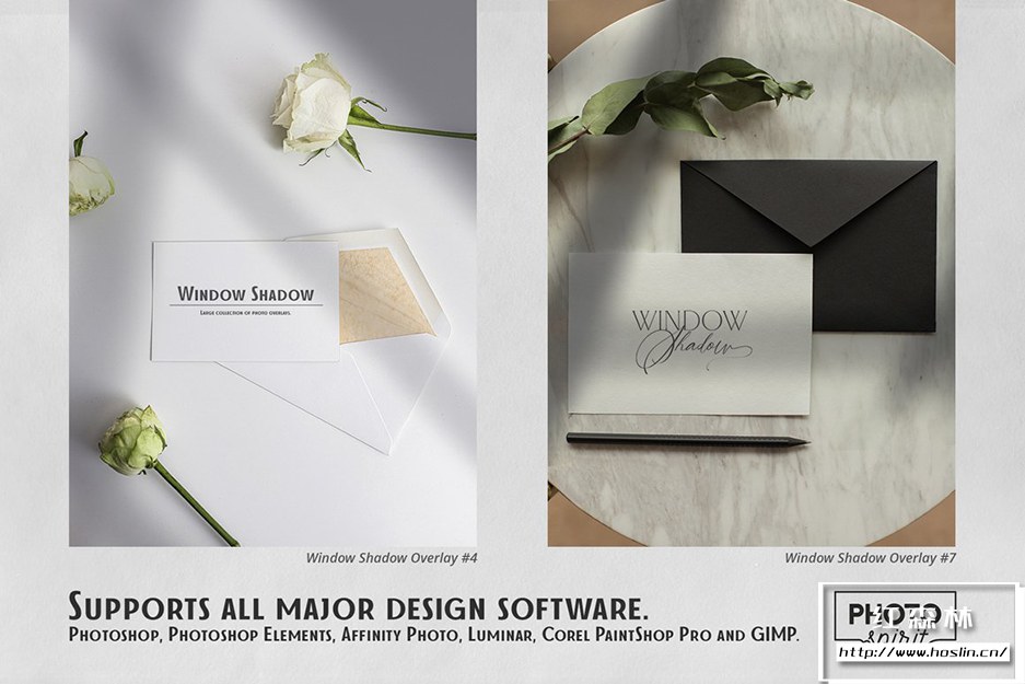 适合业余爱好者和专业人士。为了您的方便,在乘法模式下添加了选择和叠加叠加层的操作。这将适用于 Photoshop 和 Photoshop Elements。Window Shadow Overlays 可以在任何图形编辑器中使用,它支持在 正片叠底 模式下进行图层叠加。