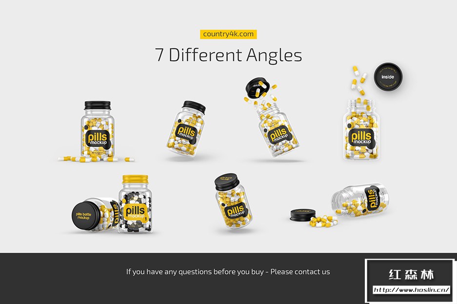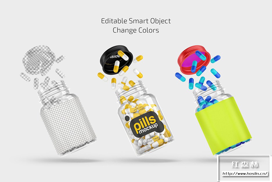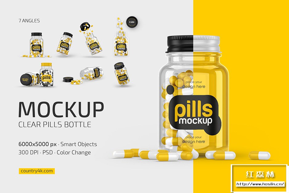 使用 Clear Pills Bottle Mockup Set 创建精彩的演示文稿。使用我们的模型展示您的徽标、品牌等。毕竟,它们是高分辨率制作的。而智能对象可以节省大量时间。只需点击智能对象几次,添加您自己的图形并保存结果。一切都很简单!我希望你会喜欢它。