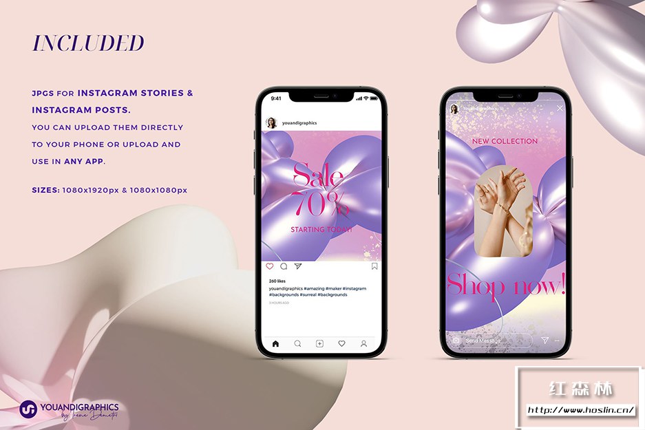 该集还包括适用于Instagram 帖子和 Instagram 快拍的 JPG 图片,您可以将它们直接上传到您的手机或任何社交媒体应用程序(例如Canva),并用作您的营销背景。