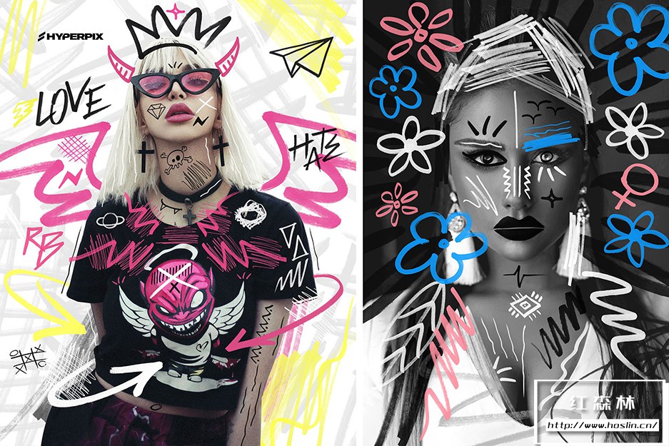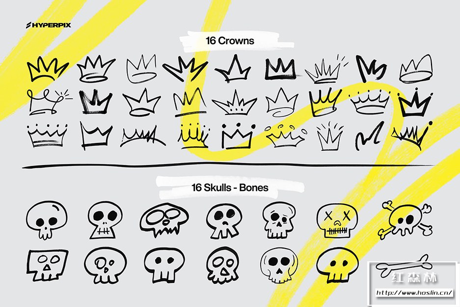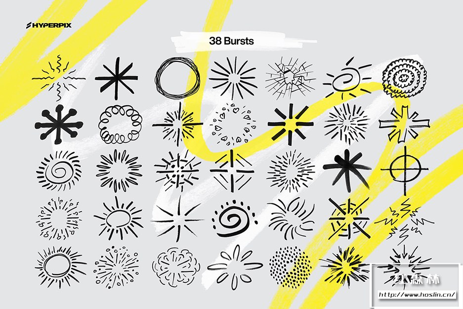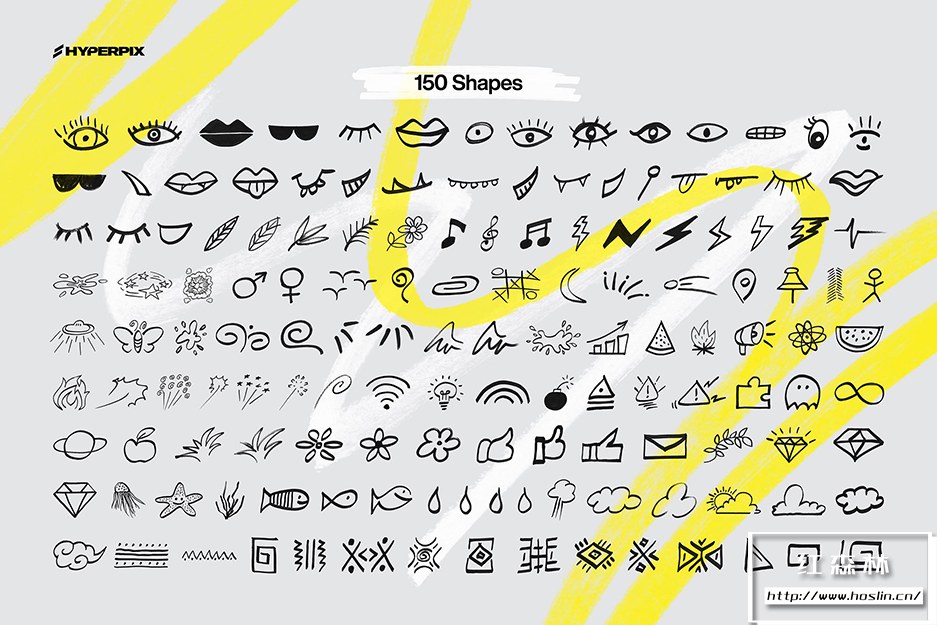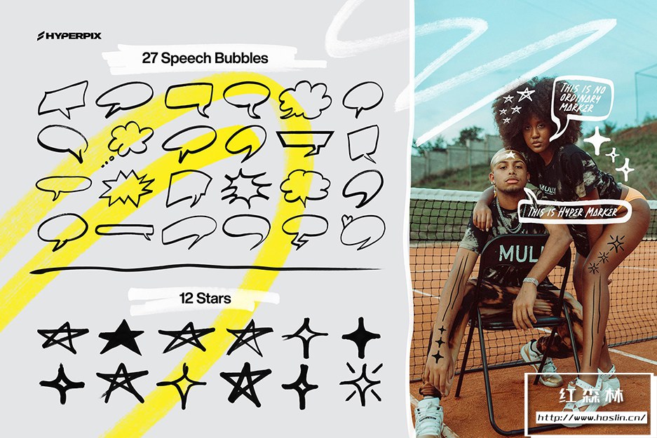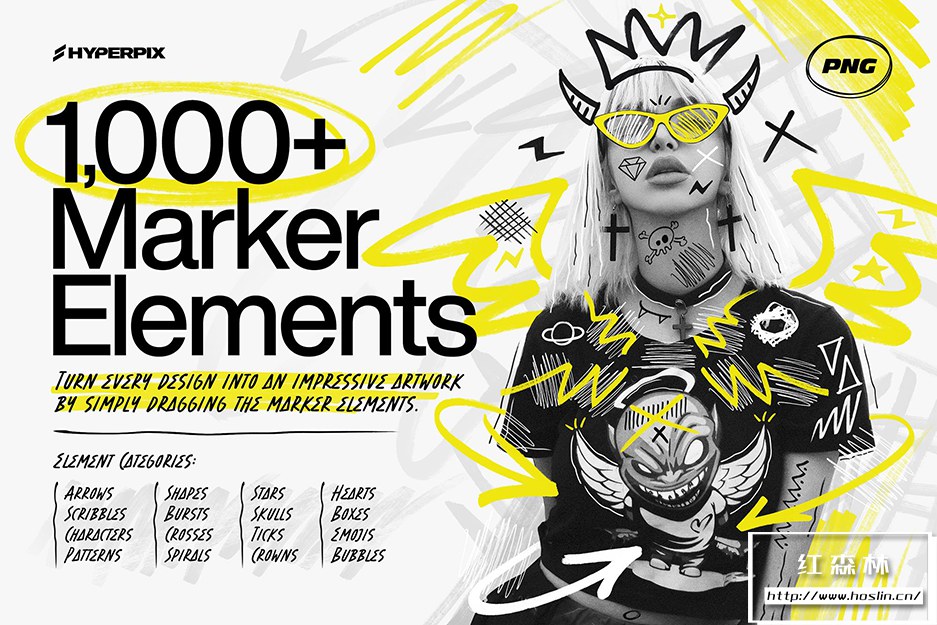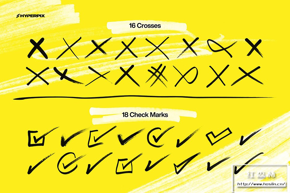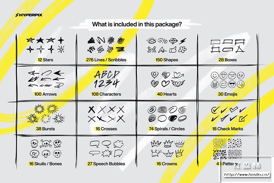 使用图形设计领域最丰富的标记元素集合,让您的设计脱颖而出。包装超过 1000 件,这里有各种元素。Hyperpix 的标记纹理超级包包括手绘圆圈、方框、刻度、涂鸦、心形、漩涡、箭头、星星、十字、线条等多项。不要忘记,还有这两个系列的字母字符,如标记字体,仅在此处以 PNG 格式提供。