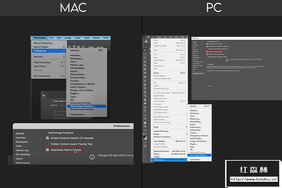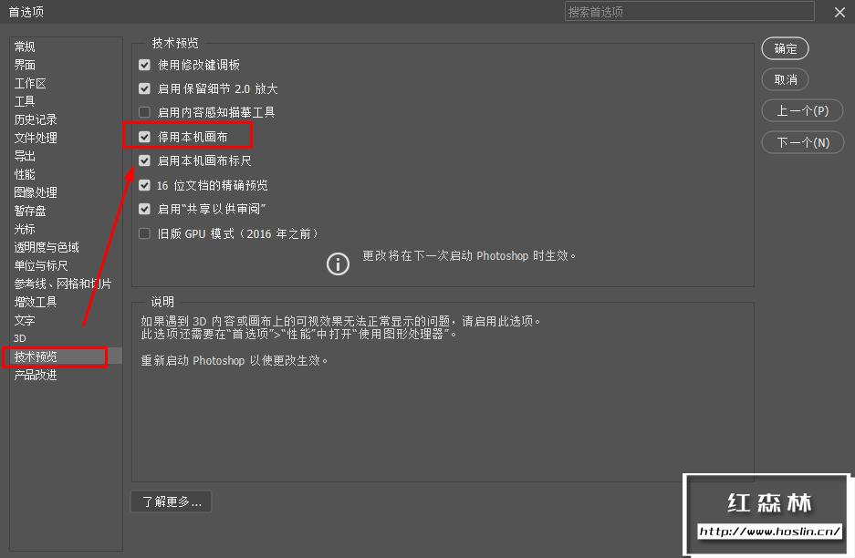 Mac 和 Windows用户,请确保按照以下步骤设置您的 PS 设置:首选项 – 技术预览,勾选“停用本机画布”,然后重启Photoshop。