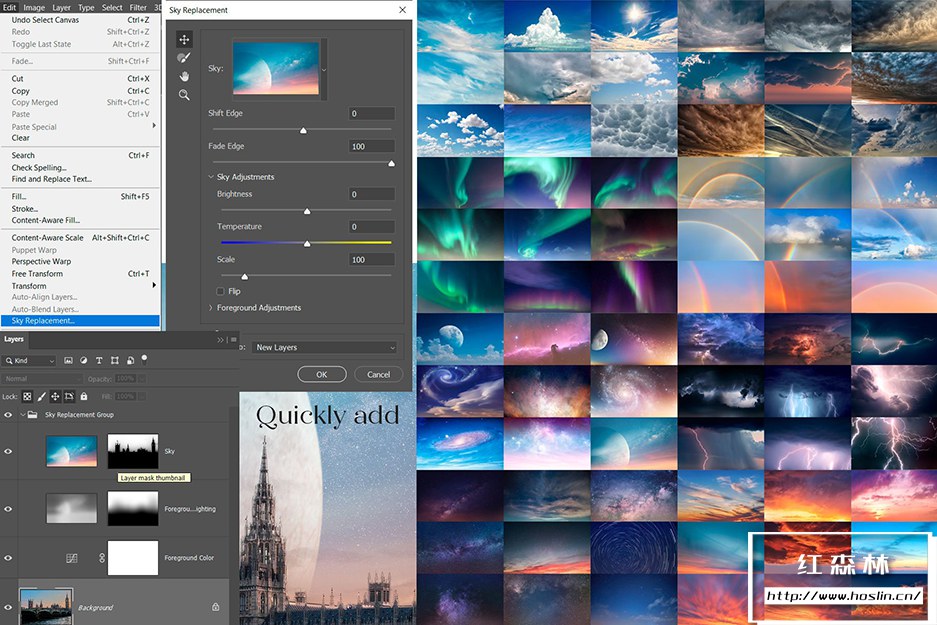Adobe Photoshop 自2021版本开始有一个很棒的功能:自动更改天空:只需单击几下,您就可以更改照片中的天空,并对其进行调整以获得更真实的效果。基于 AI 的算法可识别照片中的天空边界,并在选择替换天空时创建带有遮罩和颜色调整的图层。