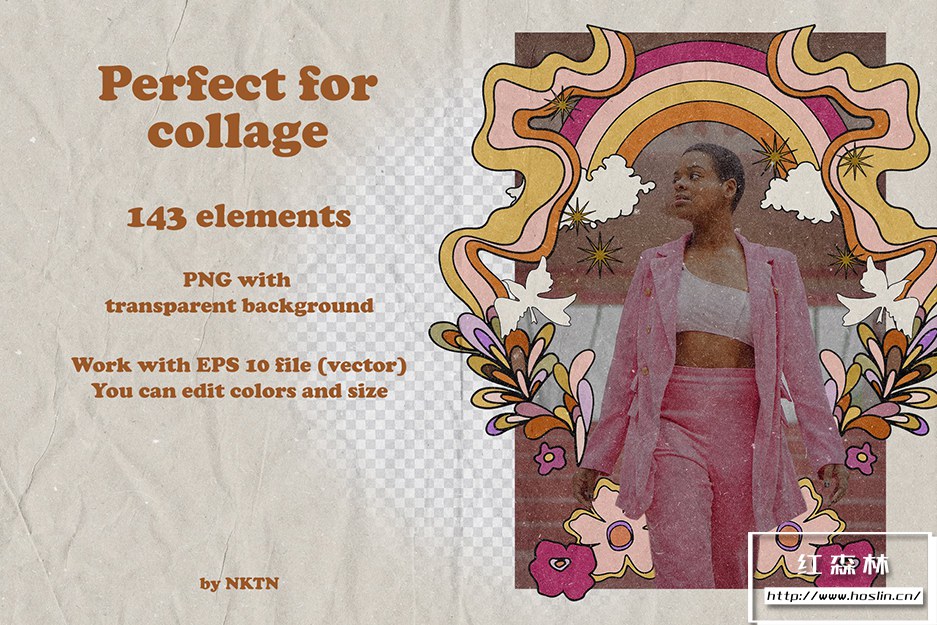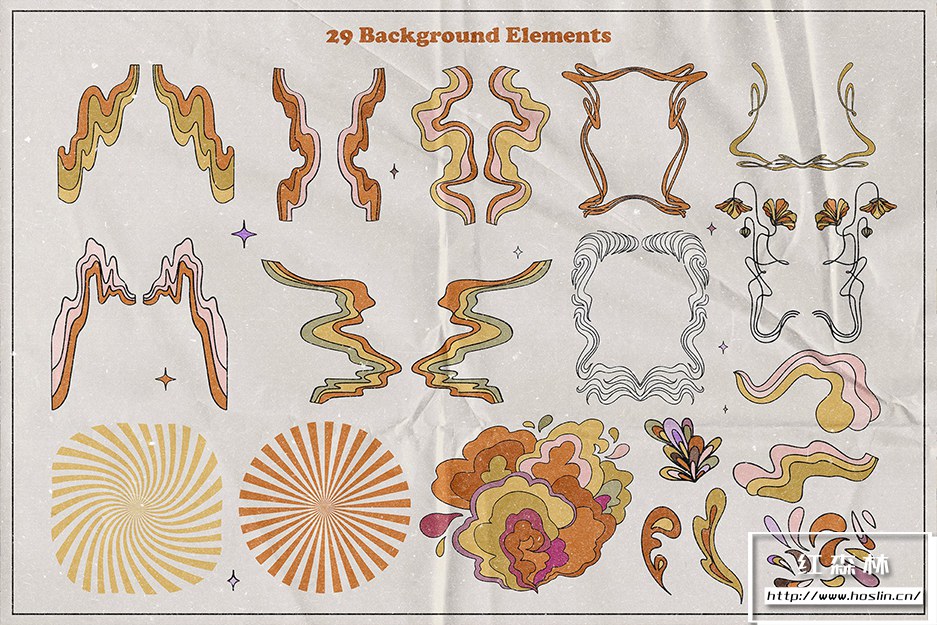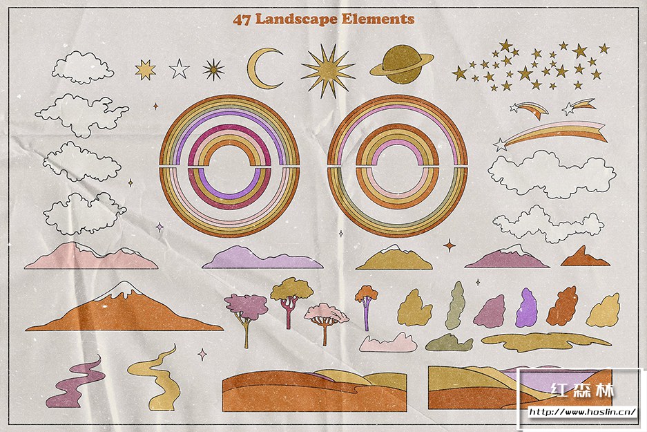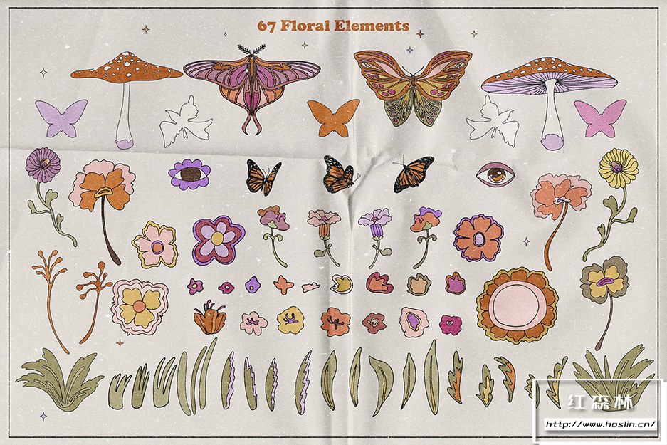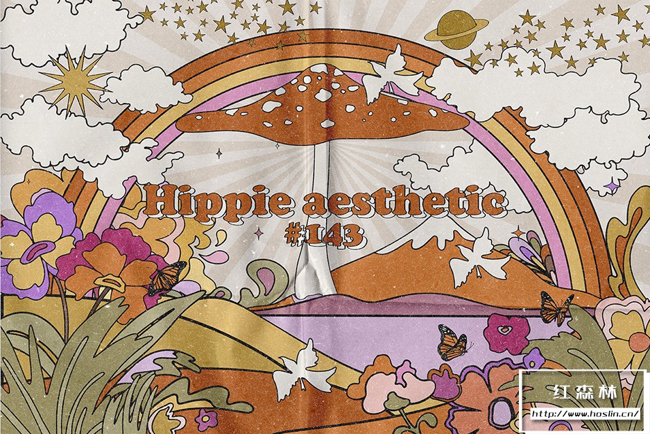 嬉皮美学中的矢量图集。143种元素:花卉、风景、抽象彩虹元素。非常适合海报、拼贴画、品牌设计和时髦且复古的婚礼设计。