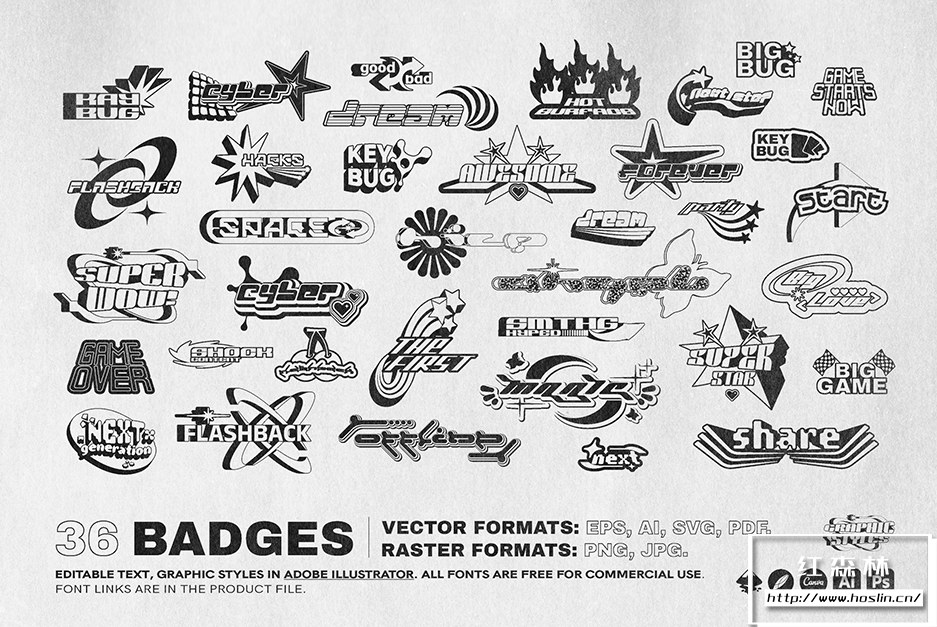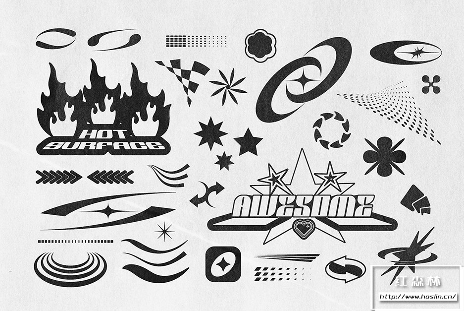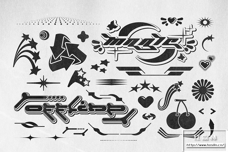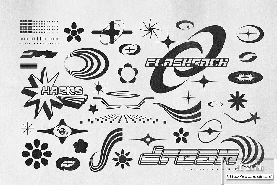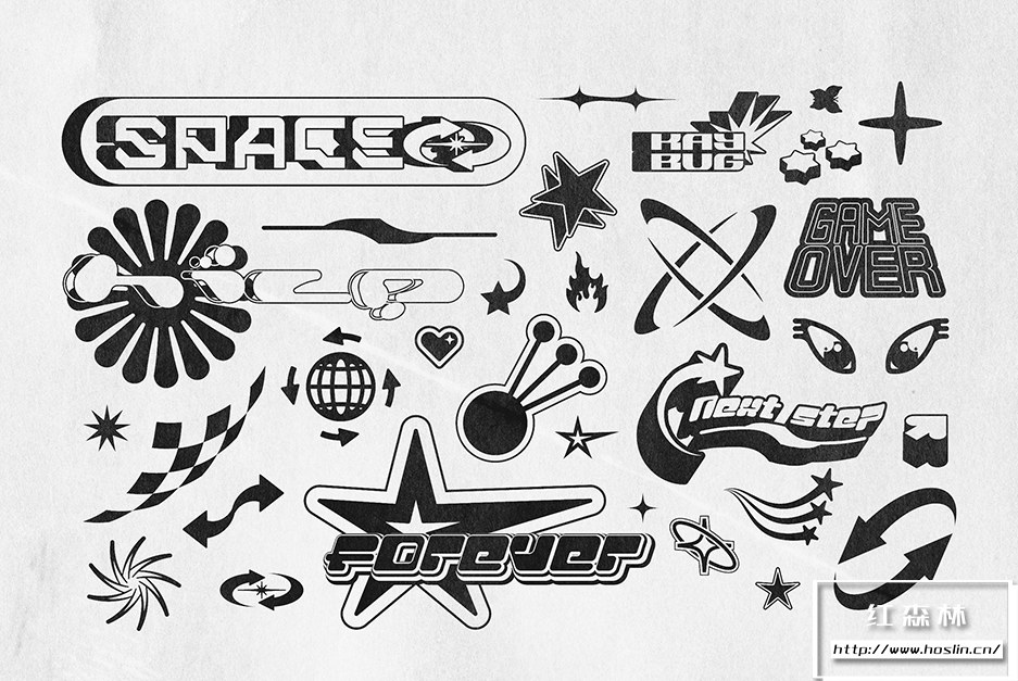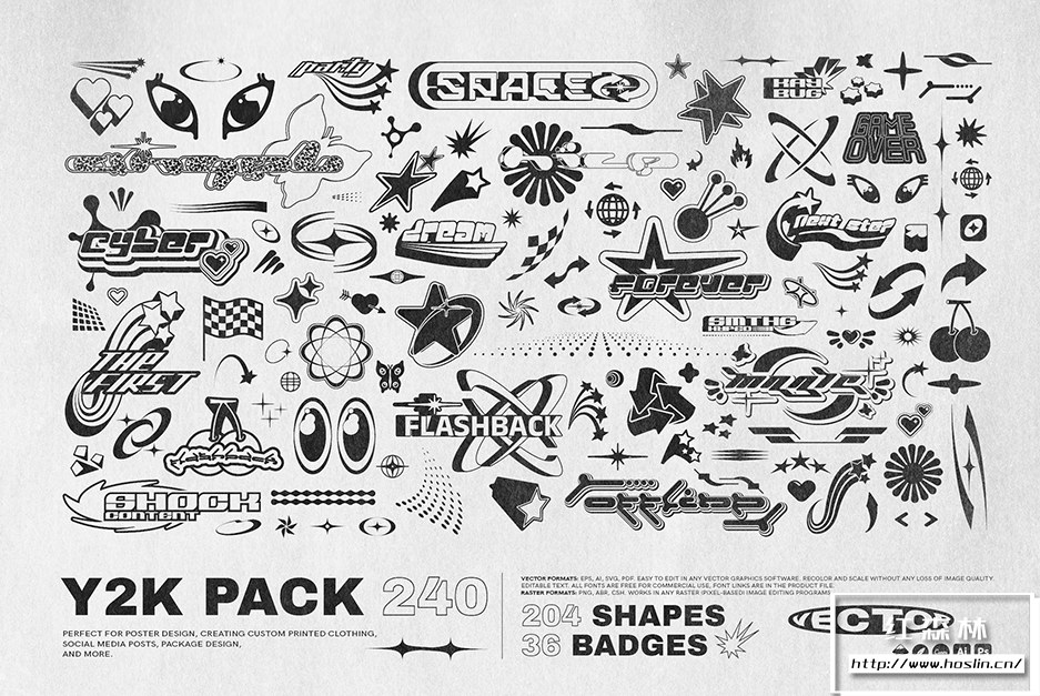 “Y2K 240 Shapes Badges Graphic Styles”中的设计元素非常适合时尚海报设计、定制印花服装、街头时尚品牌、标志设计、社交媒体模板、帖子、包装设计等。这些非凡的图形资产可以补充您大胆的现代设计项目并节省您的时间。
