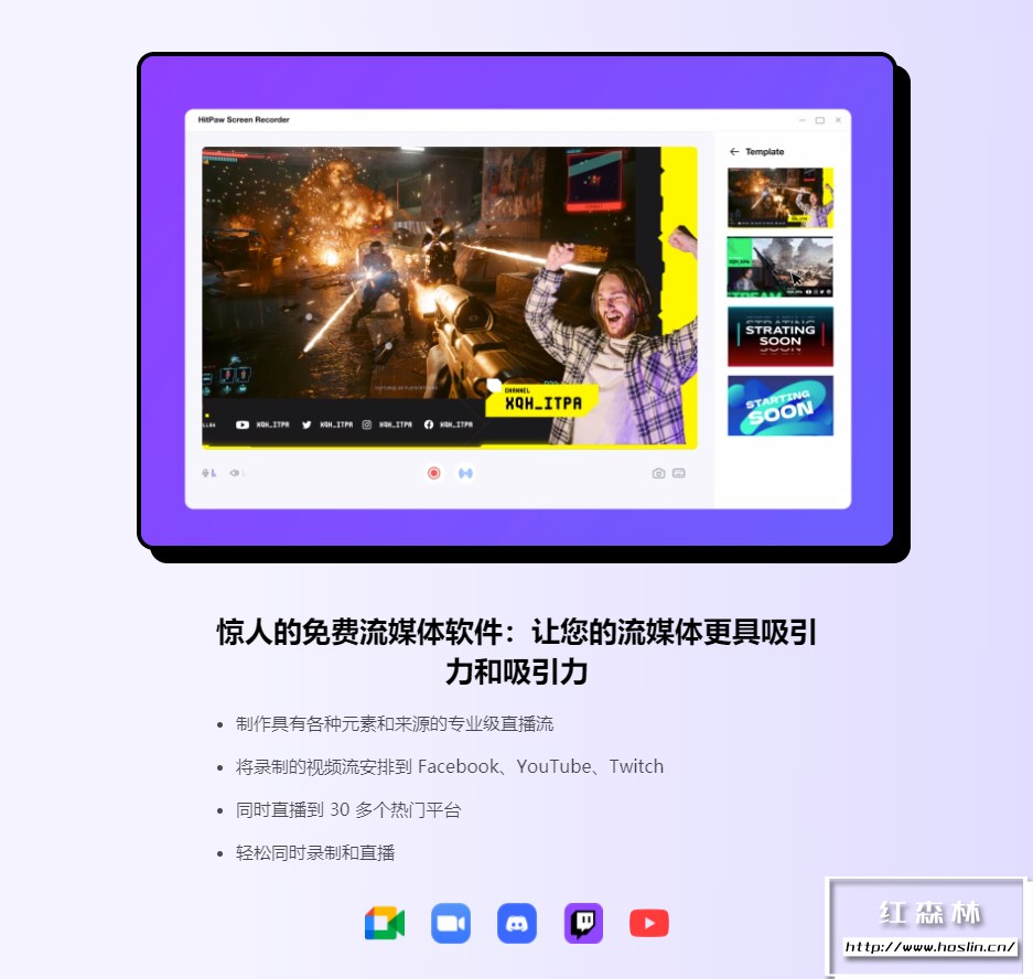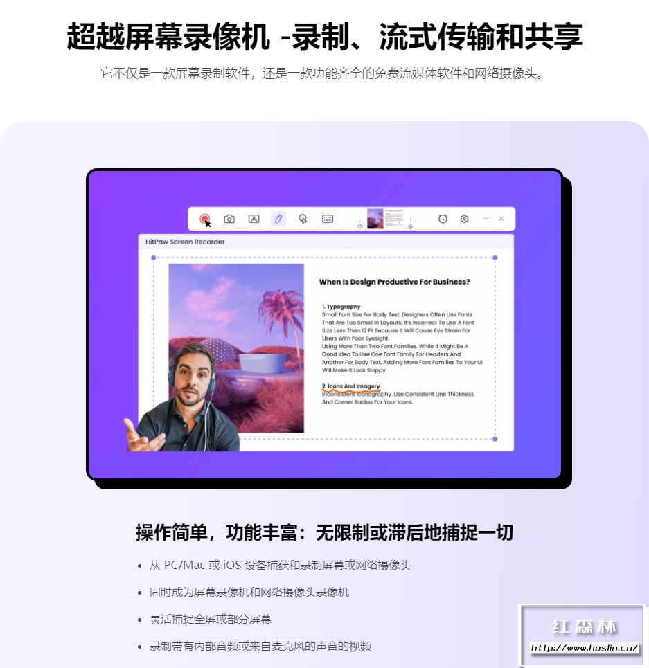HitPaw Screen Recorder,它不仅是一款屏幕录制软件,还是一款功能齐全的免费流媒体软件和网络摄像头,可让您捕捉和录制网站、讲座、视频通话以及屏幕上的任何内容。您可以像专业人士一样在 Facebook、YouTube、Twitch 等平台上直播。Hitpaw Screen Recorder 软件界面干净利落整洁,除了屏幕录制功能以外,还有网络摄像头录制视频和使用画中画录制的模式。