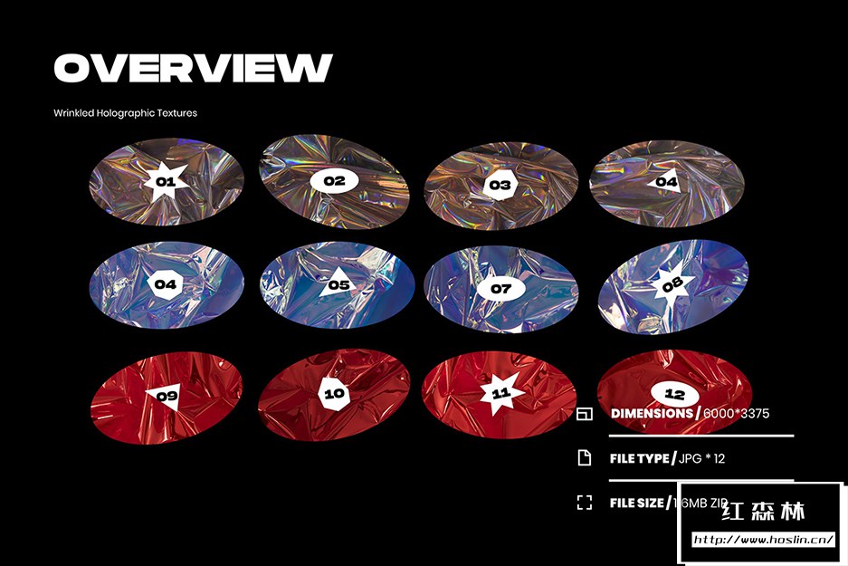 文件信息: Name:Wrinkled Holographic Textures 12个全息渐变背景 JPG文件(6000x3375px) 96DPI 文件大小:100M 声明:本站所有文章,如无特殊说明或标注,均为本站原创发布。任何个人或组织,在未征得本站同意时,禁止复制、盗用、采集、发布本站内容到任何网站、书籍等各类媒体平台。如若本站内容侵犯了原著者的合法权益,可联系我们进行处理。